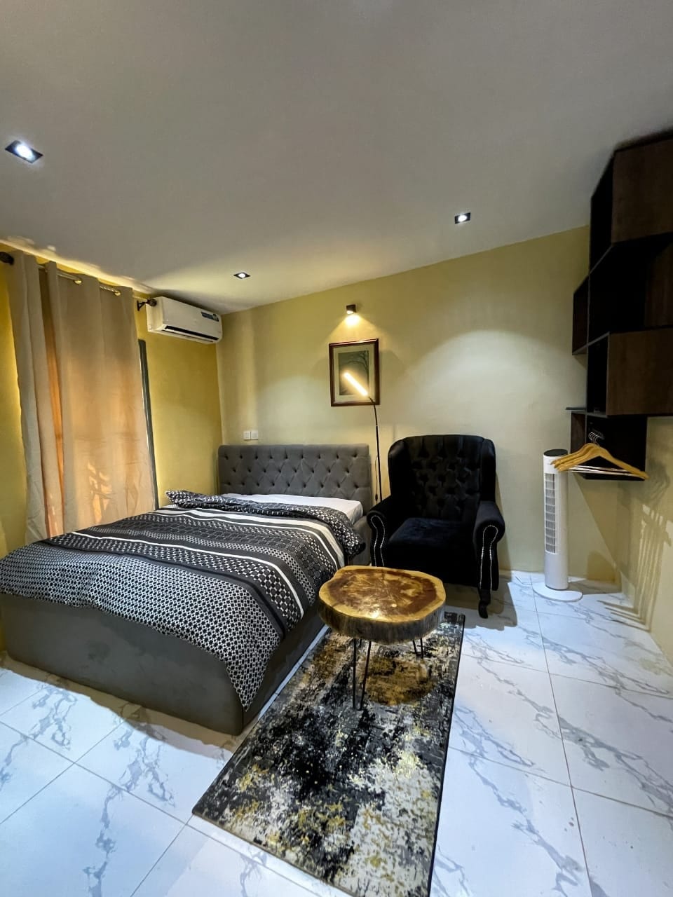 Uteč do Olumideho klidné oázy v centru města! Náš luxusní 3lůžkový apartmán s transformátorem 33 kVA zaručuje nepřerušovaný přívod energie. Odpočiň si stylově s našimi luxusními útočištěmi velikosti King a dvěma velkými manželskými postelemi, z nichž každé má vlastní koupelnu, pro maximální pohodlí. Zůstaňte ve spojení díky rychlému Wi-Fi, které je zálohovano záložním generátorem! a Netflixu s našimi 65 a 42palcovými chytrými televizory, plně vybavenou kuchyní a soukromými balkony. Ideální pro dlouhodobé pobyty, rodiny a skupiny. Rezervuj a užij si stylový odpočinek