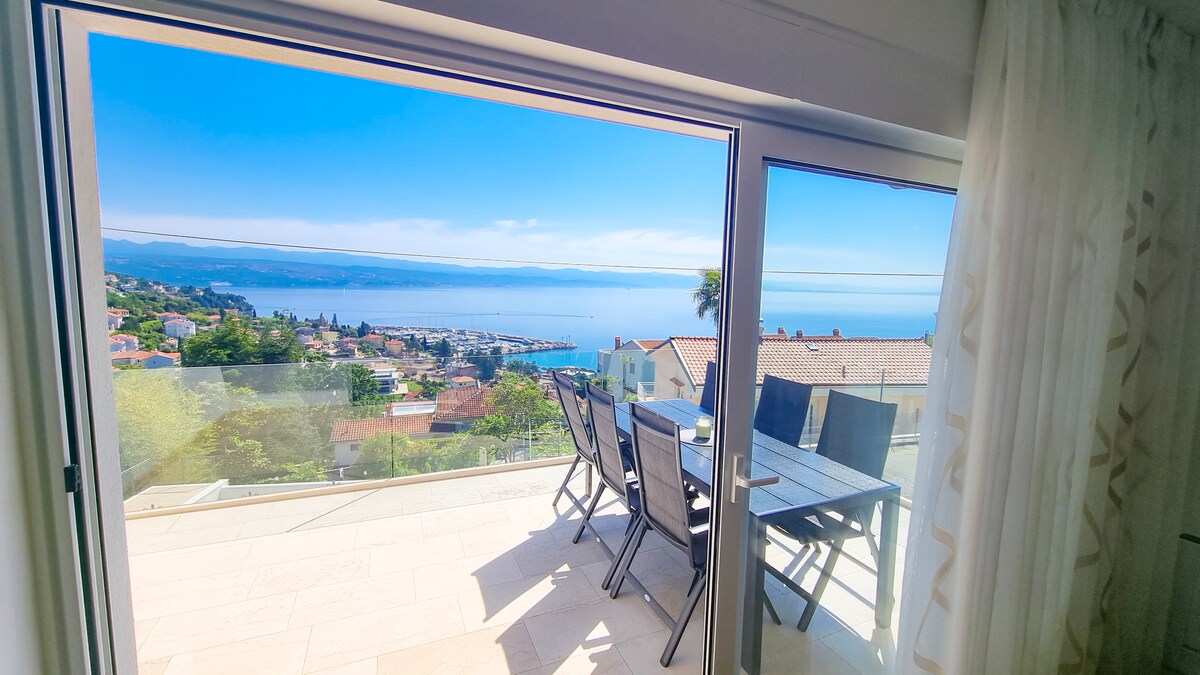 Apartmán se nachází v letovisku Ičići, 800 metrů od pláže a 12 km dlouhé pobřežní promenády. Je plně vybaven a skládá se z obývacího pokoje s kuchyní a jídelnou, 3 ložnic, 2 koupelen (sprcha, WC) a další samostatného WC. Apartmán je ideální pro 6 osob, další 2 osoby se vyspí na rozkládací pohovce. Každá z ložnic má balkon, z obývacího pokoje lze vyjít na velkou terasu se stolem, posezením a výhledem na moře. V zahradě mají hosté k dispozici plynový gril, vířivku, stůl na stolní tenis, šipky atd.