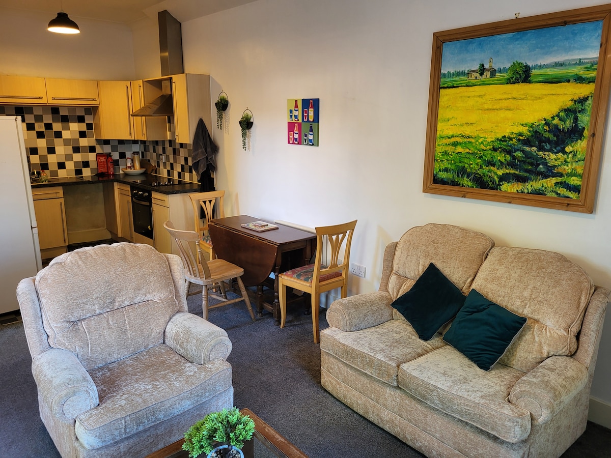 Our first floor flat offers twin bedded room with shower room, kitchen, Internet, TV and underfloor heating. Sunny aspect with windows on both sides. View over garden and countryside. The house is set back about 100 yards from the road and is therefore quiet. It has plenty of off road parking and a bus stop outside. Within 400 yards we have a pub, Chinese and Indian restaurants, cafe and newsagents. Nearest supermarket is one mile away.