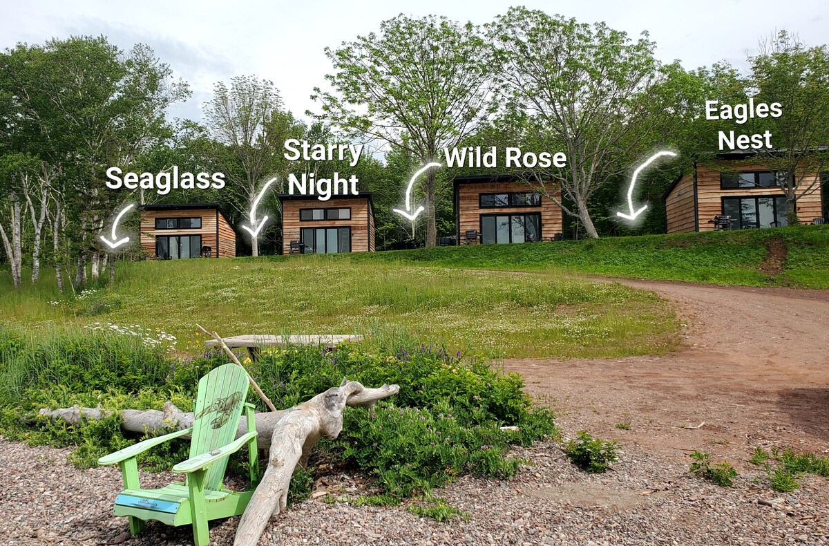 Welcome to Indigo Hills Eco-Resort Modern, off-grid, eco-friendly cabins situated on the beautiful Bras d' Or Lakes! Just steps away from the beach, with unobstructed views of the lake from inside each cabin. Incredible sunrise, sunsets, and stargazing. Don't forget your swimsuit and waterhoes! outdoor games, SUP boards, kayaks, and campfires on the beach. Each cabin features an open concept design, including a fully stocked kitchen, sleeping area, and bathroom