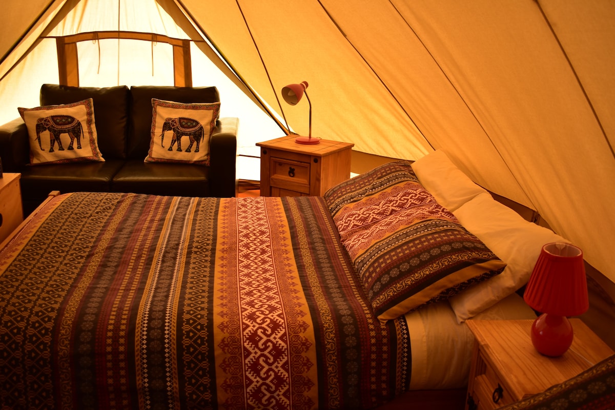 Náš stan Bell Tent je butikový glampingový zážitek pro dva s možností zahrnout třetí osobu. Krásně zařízený s manželskou postelí, vnitřním a venkovním posezením, péřovými polštáři, vlněnými přikrývkami, útulnou kokosovou podlahou a zdobený ručně vyráběnými vlajkami a solárními světly. Začněte svůj den kontinentální snídaní. Odpoj se od světa v našem půvabném stanu.