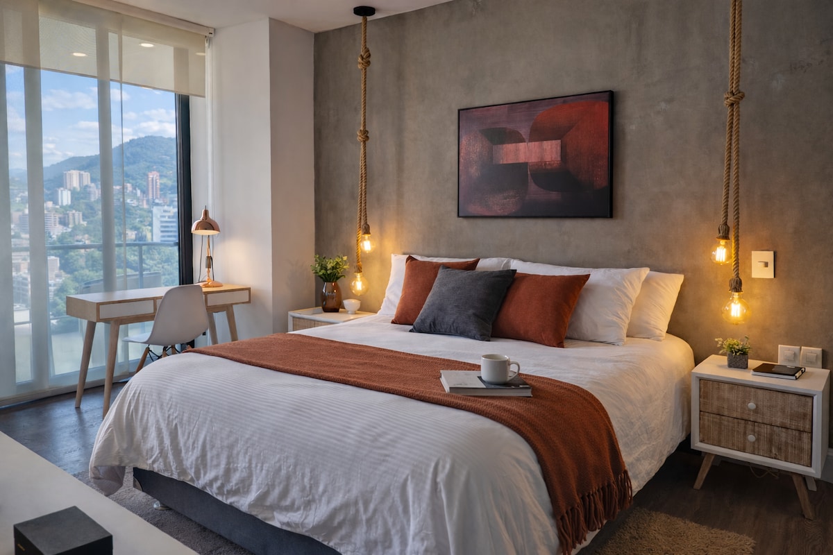 Nádherný nový byt se širokým výhledem na město a jeho hory se nachází v jedné z nejluxusnějších čtvrtí Medellínu, Nachází se v blízkosti univerzity Eafit, na velmi klidném místě, v blízkosti Parque El Poblado,Parque Lleras, stanice metra, obchodů s potravinami . Vybaven/a vším, co potřebuješ k tomu, aby sis užil/a příjemný pobyt. Má malou kuchyň s potřebným nářadím; klimatizaci, internet o rychlosti 200 Mb/s, chytrou TV, vlastní koupelnu, velké okno a další