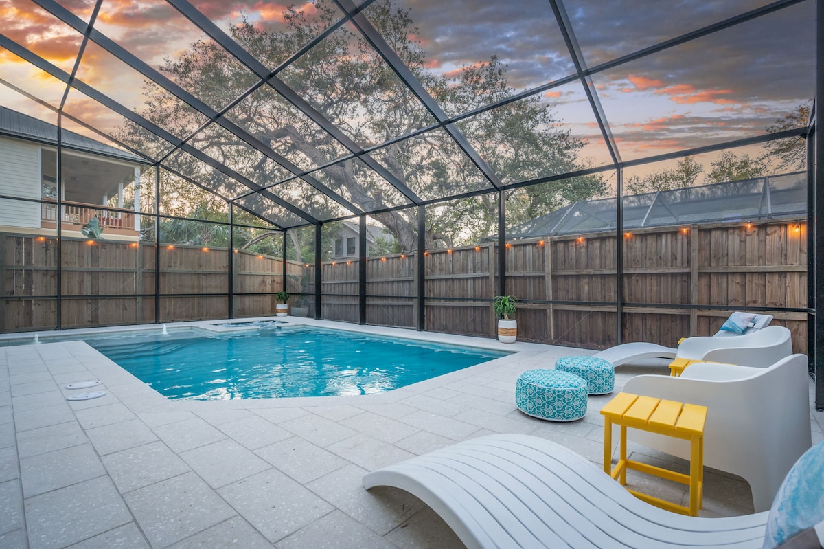 * Postaveno v roce 2023 - luxusní pobřežní nábytek a povlečení * Uvedeno v časopise Good Housekeeping Mag 2024🌟 * 2 apartmá s manželskou postelí King (1 na každém patře) | 2 ložnice s manželskou postelí velikosti Queen | 3,5 koupelny * Soukromý bazén se slanou vodou a lázně/vířivka * Cabana u bazénu | Venkovní kuchyně | Přední veranda * Jízdní kola, plážové hračky, plážová křesla * Bohatá tropická zahradní architektura * 0,2 míle - nádherná klidná pláž * 5,5 míle – historické centrum St. Augustine – nejstarší město ve Spojených státech! * 0.2 miles - Cap's Restaurant for sunset dinner on the water