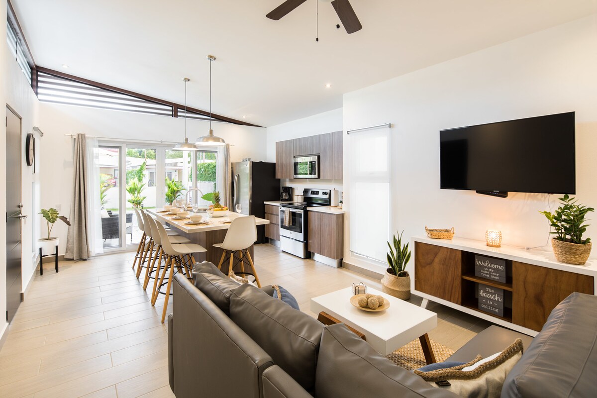 Tento nový dům, který byl vyvinut s moderním architektonickým designem, otevřeným půdorysem a 50% zelenými plochami, čeká na vás! Pouze 600 metrů od pláže (10 minut). Dům má 3 ložnice plně zařízené jedinečným a zakázkovým nábytkem ručně vyrobeným zkušenými kostarickými řemeslníky. Má soukromý bazén a je to JEDINÝ dům se soukromou zadní terasou pro setkávání. Jedná se o uzavřenou komunitu s nepřetržitou ostrahou. V tomto domě se budete cítit vítáni, v bezpečí a uvolněni. Užijte si návštěvu!