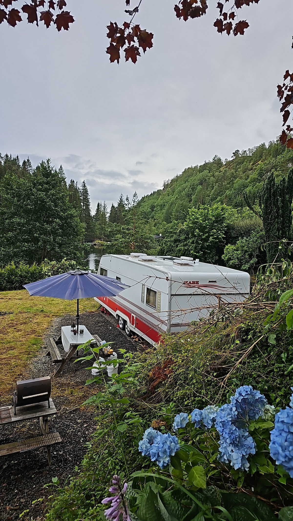 En enkel og simpel campingvogn, uten dusj - varmvann fåes vha vannkoker. Toalett på badet. Varmeovn til oppvarming av vognen. Strøm og vann er tilgjengelig. Tre senger, den ene på nedfeltbar kjøkkenbord med orginale puter. Et simpelt og enkelt overnattingsmulighet som ikke lar lommeboken løpe løpsk, for den nøkterene personen. Dusjing kan foretaes på gymsal eller trenigssenter. det er en annen vogn en bildene toalett og dusj tilgjengelig inne hos verten