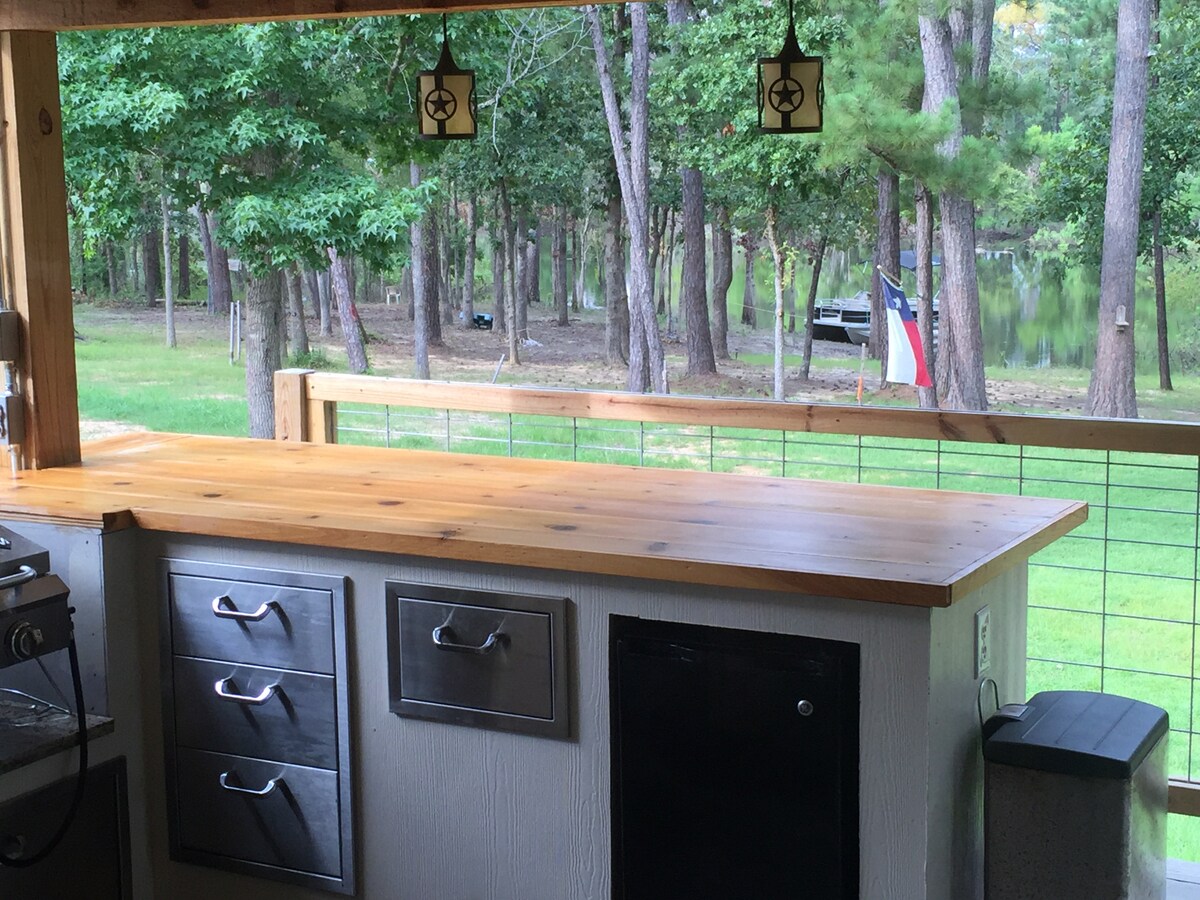 A stone throw to Rayburn golf resort, with 2 restaurants, a great little coffee shop that rivals Starbucks, swimming pool access with a fee, & pickle ball courts. Krytá terasa se 2 obrovskými stropními ventilátory , gaučem 2 židlemi a 2 pohovkami a ohništěm, grilem A spoustou židlí navíc. Na zalesněném dvorku je také další ohniště. A spousta parkovacích míst. 5 minut jízdy k spuštění lodi a k jezeru! V tomto prostorném a jedinečném prostoru se bude cítit příjemně celá skupina.