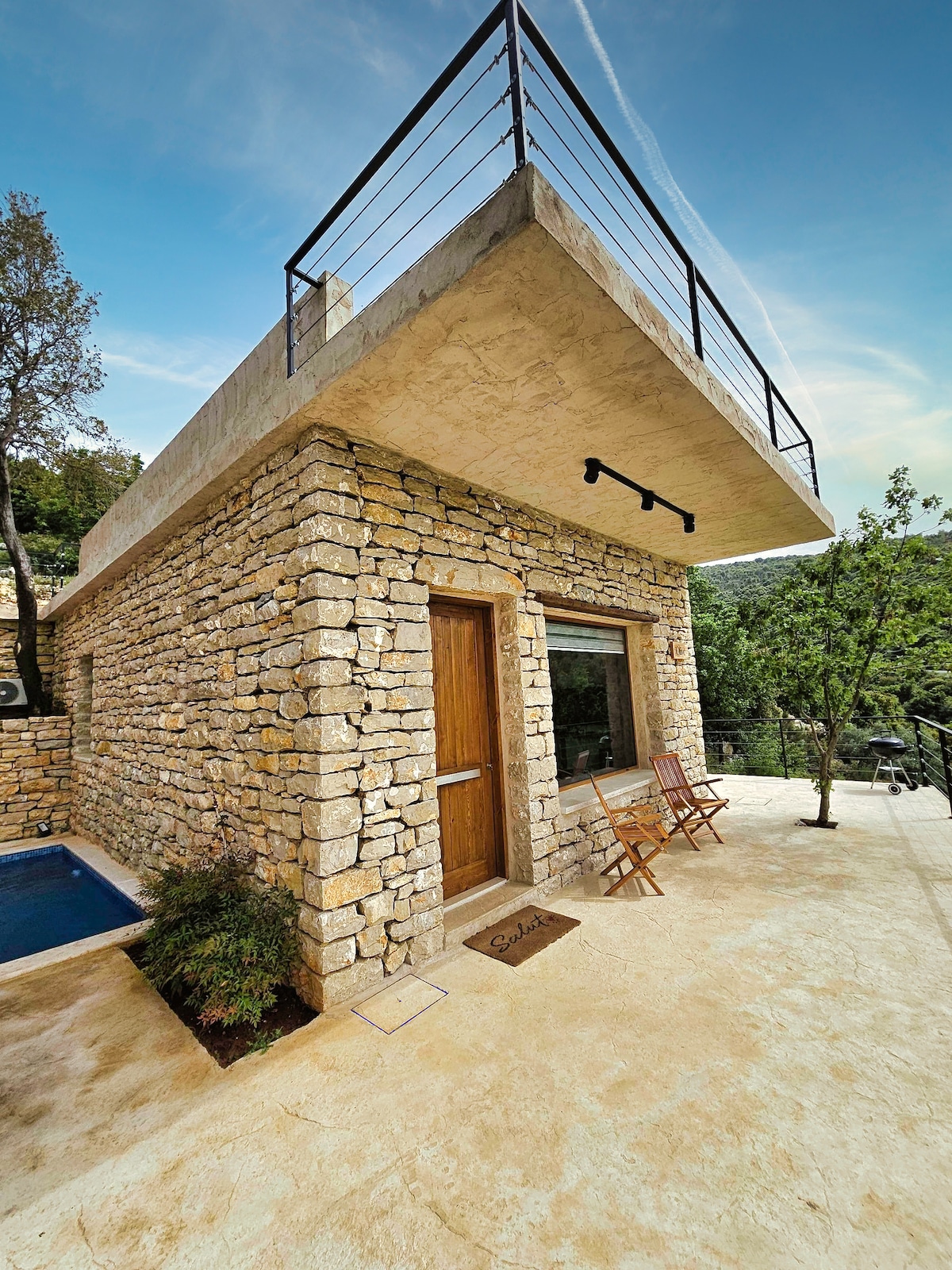 • Modern stone chalet with private pool & panoramic mountain views 🌄 • Spacious master bedroom with premium bedding & cozy décor 🛏️ • Bright open living area with Smart TV & comfortable seating 🛋️ • Fully equipped kitchenette for easy, convenient stays 🍳 • Private outdoor terrace perfect for morning coffee & sunset relaxation ☕ • Peaceful, nature-surrounded getaway ideal for couples & small families 🌿 • 24/7 electricity, AC & hot water for a comfortable stay year-round ✨