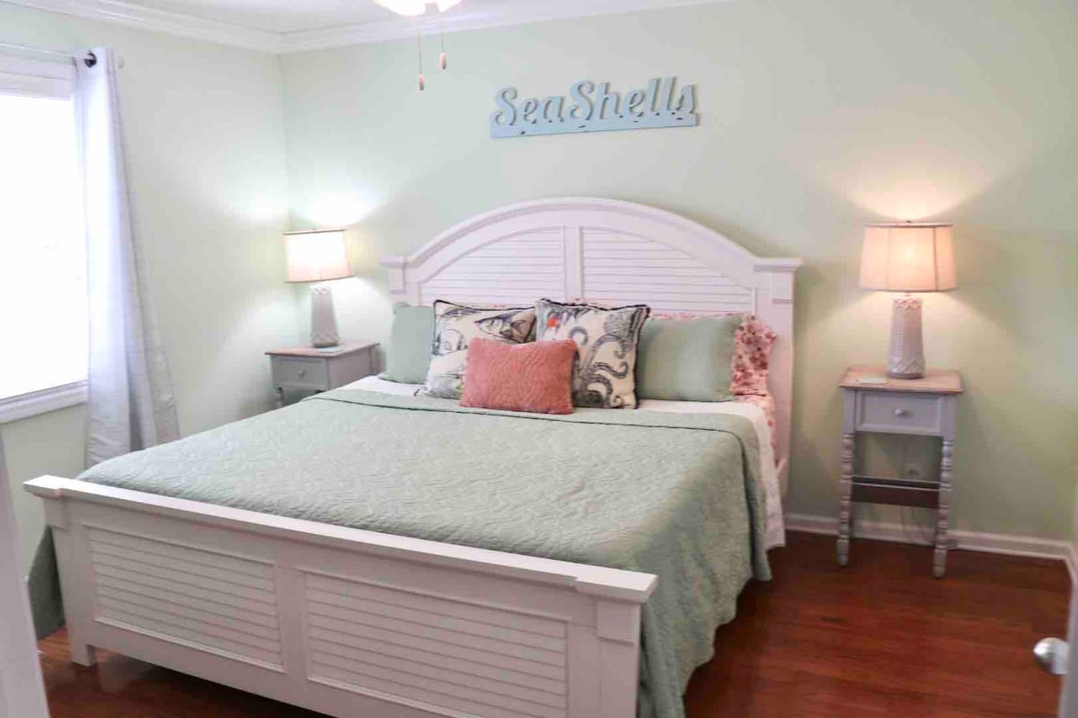 Krásný domov uprostřed ostrova vhodný pro domácí mazlíčky se 4 ložnicemi a 3 koupelnami. Nejlepší Air B&B, kde můžeš začít své ostrovní dobrodružství s plážovými koly, plážovými židlemi, vozíkem a slunečníkem v ceně! Domov je krásně vyzdoben plážovým dekorem a želvami! Hlavní ložnice má manželskou postel a koupelnu. Druhá ložnice v patře má velkou postel. Třetí ložnice má manželskou postel, čtvrtá ložnice má manželskou postel a stůl. K dispozici je nafukovací matrace velikosti Queen. V dolní části je také kávovar, minibar a mikrovlnná trouba.