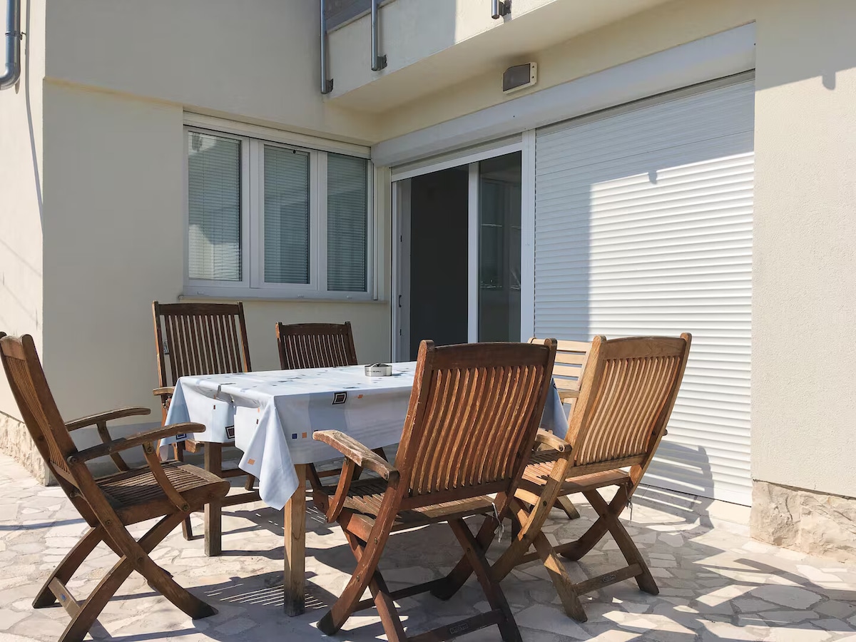 Apartmán je vybaven TV, BEZPLATNÝM Wi-Fi,klimatizací a dvorním basketbalovým hřištěm. Apartmán má koupelnu s vanou.K dispozici je manželská postel v jedné a manželská postel s přistýlkou v jiné ložnici. V obývacím pokoji je pohovka pro 2 osoby.Byt má balkon s krásným výhledem na moře a Kornati ostrovy. Byt se nachází v prvním patře, má vlastní bezplatné parkování, je 15 min. chůze od centra a asi 2 min. od písečné pláže Slanica - Skvělá poloha.