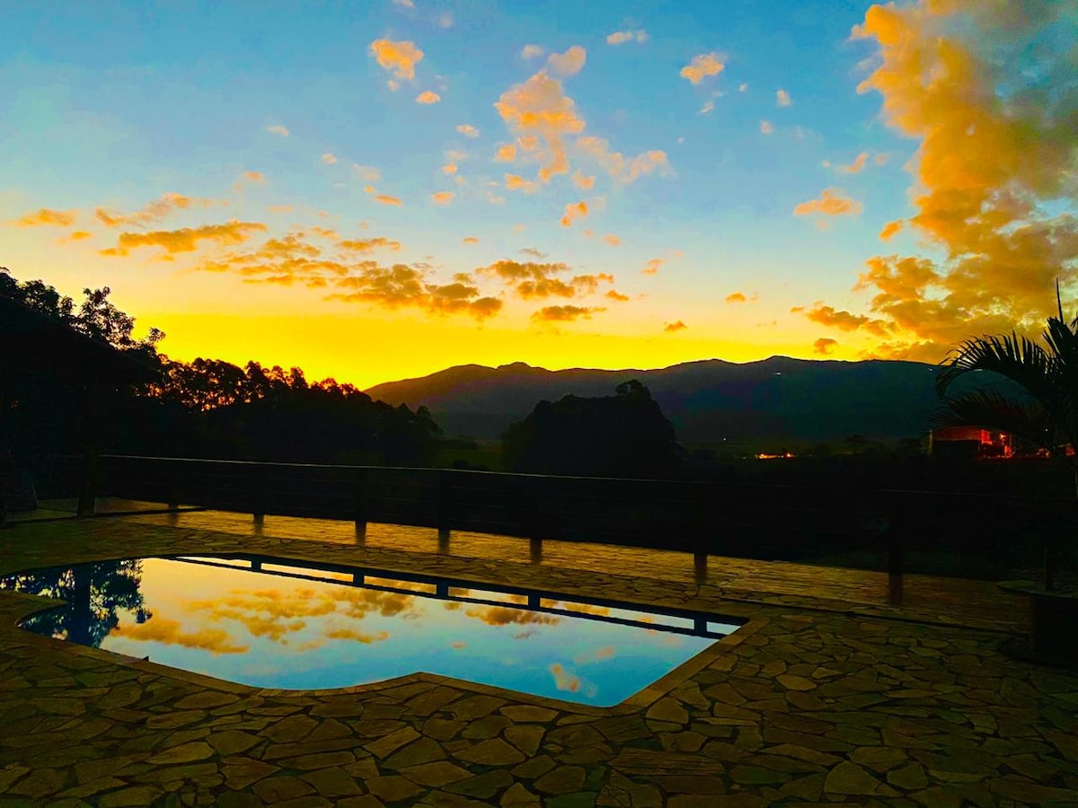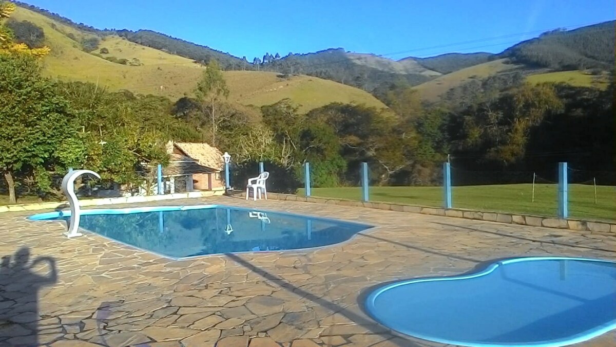 Místo převzaté z města s výhledem na hory a spoustou přírody kolem. Perfektní místo k odpočinku a pozorování západu slunce. It has a river with waterfall within the property accessed by trail. Velký bazén, gril a kulečníkový stůl. 4 krytá parkovací místa. V domě je ohřev vody pomocí elektrických sprch a kuchyň je dobře vybavena (kromě plynového sporáku je zde kamna na dřevo). Palivové dřevo se prodává samostatně, 35,00 R$. Wifi rádiem. rychlost 30Mb.