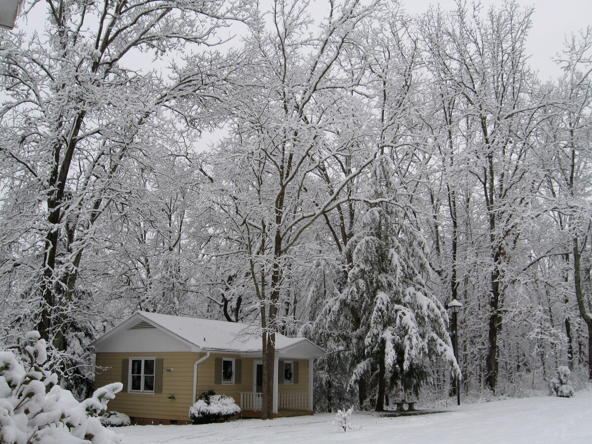 2BR/1BA Jednopatrová chata na ploše 8,5 akrů obklopená stromy. K dispozici je Wi-Fi internet se streamovacími službami, 65" Smart TV, Netflix, Hulu, knihy a deskové hry: Čaj, káva a kávovar jsou k dispozici. Neúčtujeme si poplatek za úklid, proto prosím uklízejte po sobě. Woodland Cottage je udržován svěží a čistý; pohodlně se v něm ubytuje až 6 osob. Vítáme všechny lidi ze všech oblastí života. Jsme 8 minut od I-26 a 15 minut od I-81 (přes I-26).