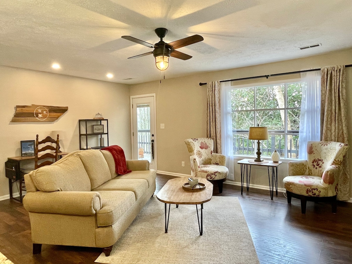 Tento dům na vrcholu kopce je skvělý pro rodiny nebo skupiny cestující společně. Otevřený obytný prostor, blízko přírody pro ty, kteří si chtějí užít venkovní prostředí. Chata je jen pár minut od centra Johnson City, Elizabethton, Erwin. Vyvýšené stropy, plynový krb, wifi a vířivka. Výhled na hory! Dvě míle od mezistátní silnice 26. Minuty od turistických tras, rybaření, raftingu, ETSU, JC Med Center a dalších. 25 minut od Bristol Motor Speedway