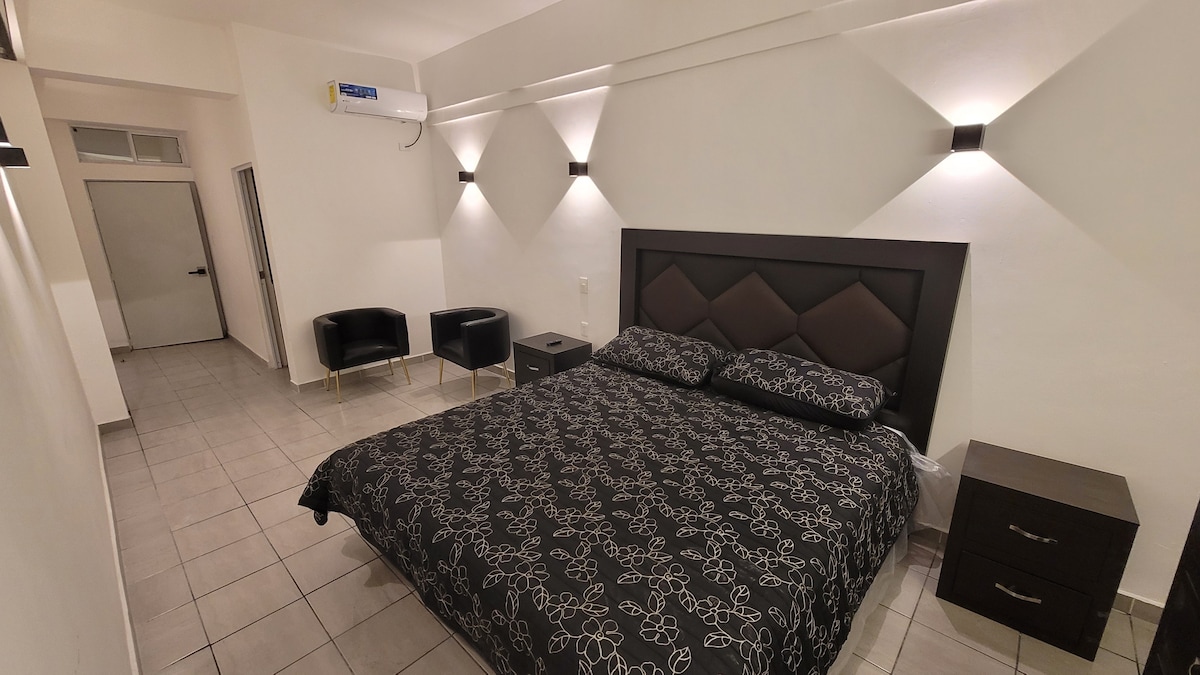 Hotel céntrico ubicado al lado del Estadio Vive & Carta blanca, a 10 minutos en auto del consulado y puentes internacionales, llegada Autonoma con un recepcionista 24 horas y con llaves propias, disfruta de una habitación climatizada en todo momento y una pequeña área para trabajar.