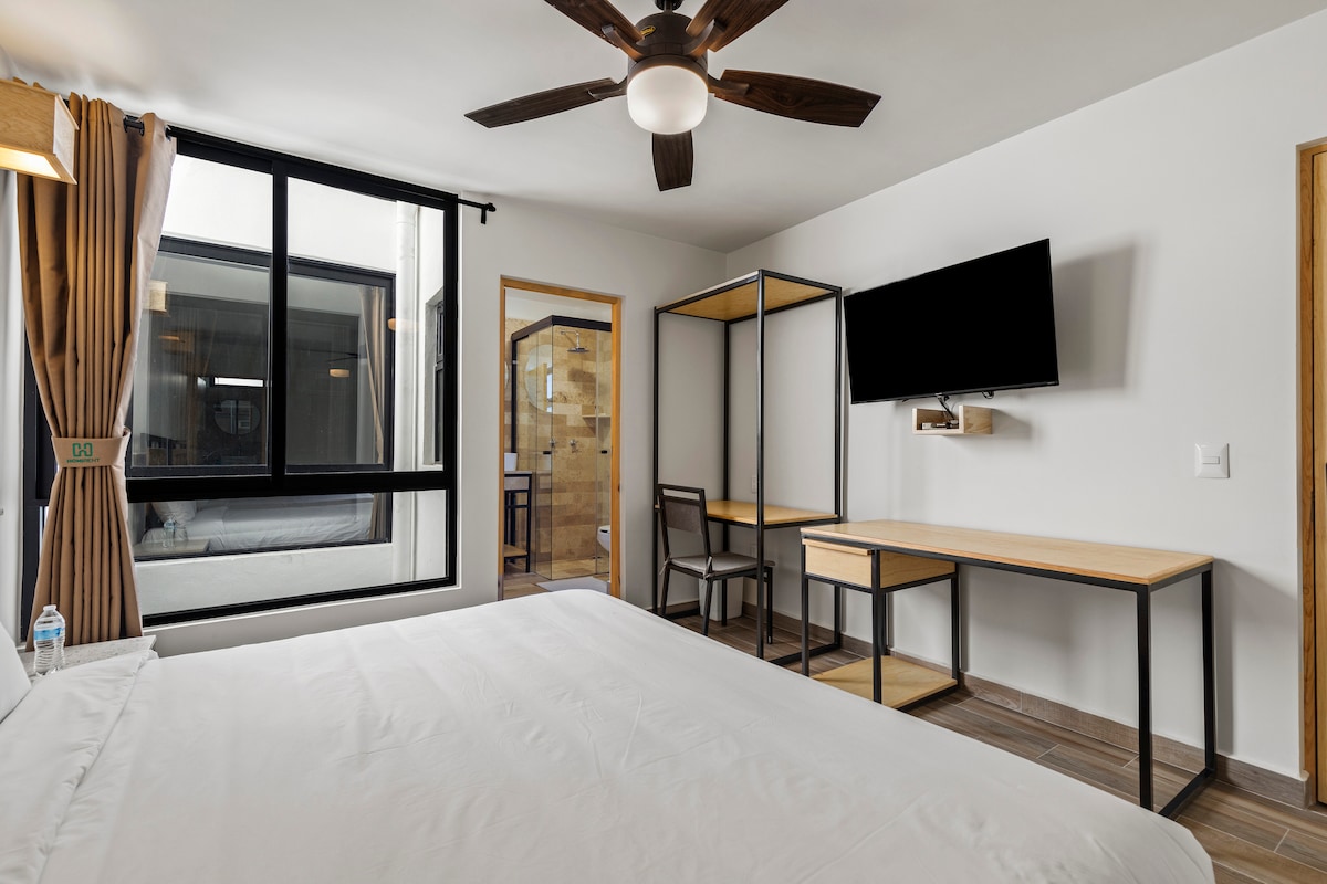 ¡Objev nejúchvatnější výhledy v Querétaro! z tohoto moderního apartmánu v průmyslovém stylu. Jen 10 minut od centra města si můžeš vychutnat neuvěřitelný výhled na město i hory. Ideální pro skupiny do 6 osob. Je ideální pro služební cesty nebo zábavu pro snadný přístup, obchody a možnost ubytování. Pokoje mají klimatizaci a topení. Zažij pohodlí, které tento byt nabízí.