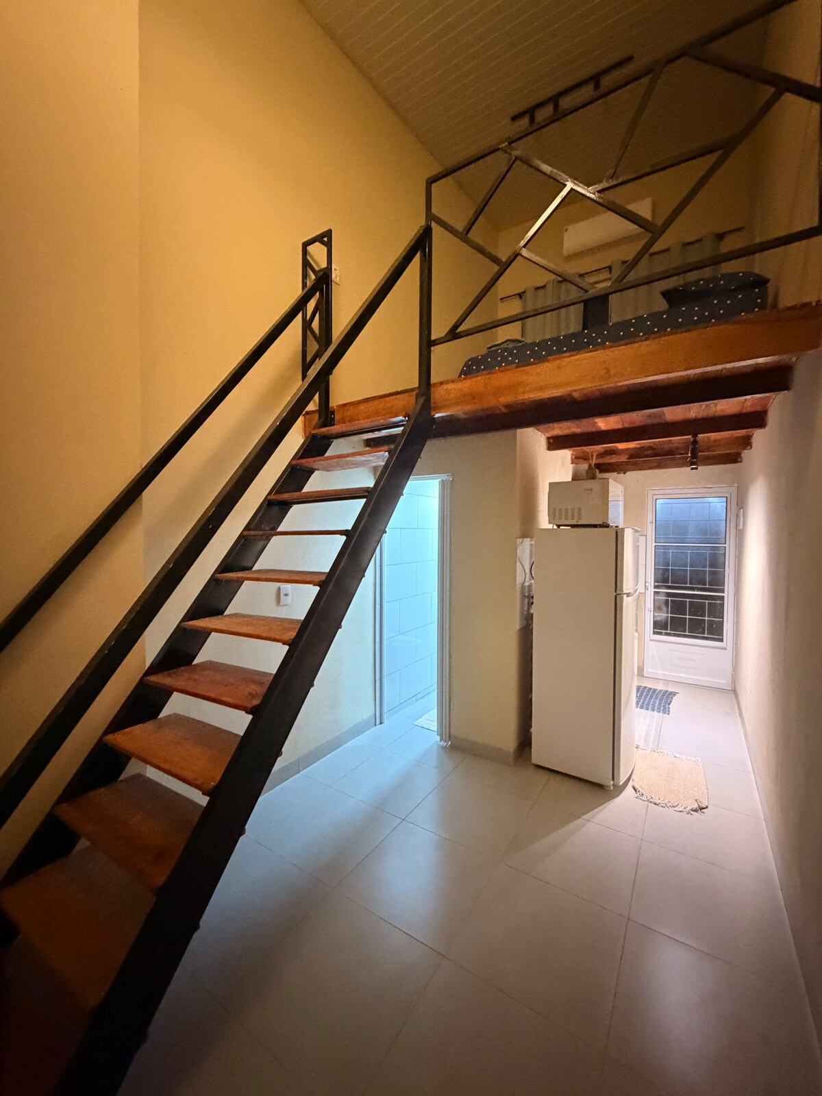 Studio poblíž centra Campo Novo do Parecis, ideální pro ty, kteří přijíždějí služebně nebo jsou jenom na průjezdu. Manželská postel, kuchyňský kout, klimatizace, která chladí celý prostor, Wi-Fi a televize. Kompaktní a dobře využitý. Nestandardní dekorace: modrozelená stěna, dřevo a rostliny. Čisté a připravené na tvůj příjezd. Samoobslužné ubytování; kód k uzamykatelné schránce ti přijde před tvým příjezdem.
