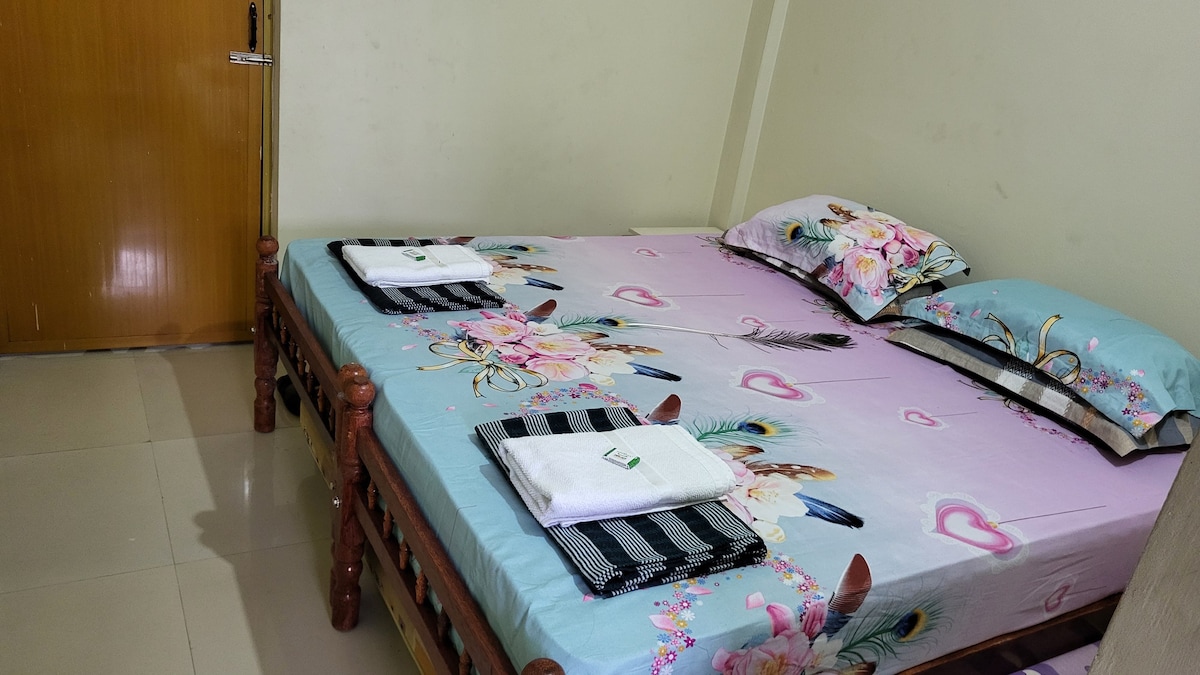 Samostatný 1pokojový apartmán: Prostorný, jednoduše zařízený pokoj s klimatizací, připojená plně zařízená kuchyňka a moderní koupelna/toaleta. Nachází se na 12akrové farmě, sousedící s domovem hostitelových předků v dobře propojené vesnici Kanichukulangara. Nemovitost se nachází vedle slavného chrámu Devi. Ideální pro trávení času s rodinou nebo pro práci odkudkoliv. Užijte si zeleň, ticho, vesnický šarm nebo si zajezděte na pláž, která je vzdál 2 km.