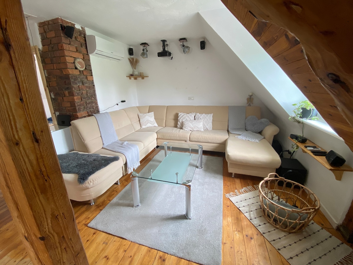 Central, historic, individual & spacious: Welcome to our beautiful 85m² maisonette apartment in the middle of the picturesque old town of Ettlingen. It is part of a listed building that has existed since the 17th century. You will sleep where stablehands and coachmen stayed over 200 years ago. It has been lovingly renovated. Discover the original charm of the sandstone wall and wooden beams, combined with the aesthetics of a bright loft with an open-plan concept.
