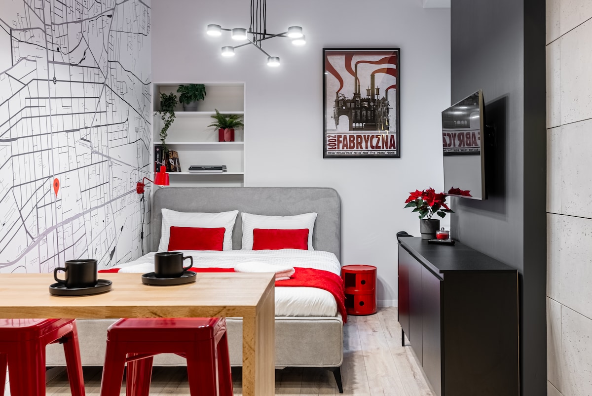 Stylowy apartament typu studio idealnie nadający się na nocleg w samym sercu Łodzi. Oddalony 1 km od ulicy Piotrkowskiej - słynnego łódzkiego deptaka. Dzięki sejfom na klucze zameldowania i wymeldowania odbywają się w prosty, samodzielny i szybki sposób. Do dyspozycji gości rozkładana kanapa oraz sypialniana antresola. Apartament znajduje się w oficynie zrewitalizowanej łódzkiej kamienicy. Posiada on w pełni wyposażoną kuchnię oraz wszelkie niezbędne środki czystości i udogodnienia.