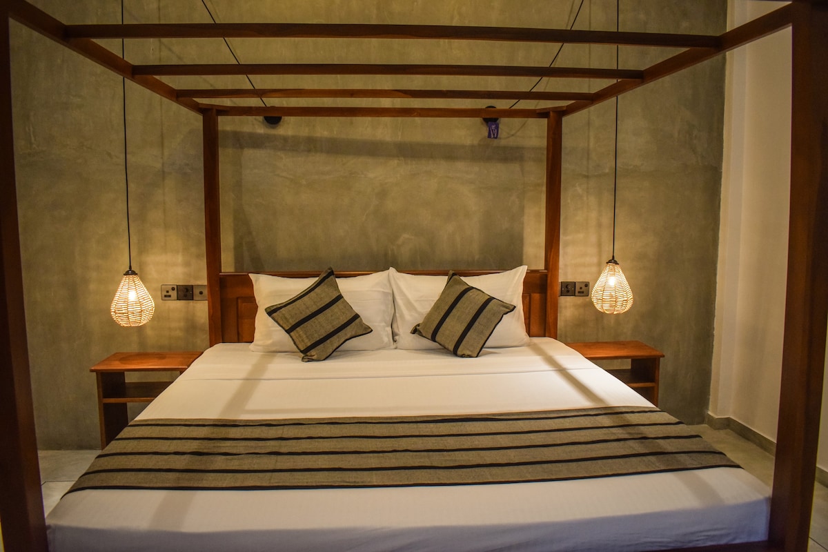 Ubytuj se v Hello Mirissa, kde se setkává moderní design s tropickým klidem. Tento luxusní butikový pokoj vybavený klimatizací zahrnuje manželskou postel velikosti king, připojenou koupelnu se sprchovým koutem a soukromý venkovní jídelní kout ideální pro klidné stolování. Ideální pro páry nebo služebně cestující, kteří hledají klid v blízkosti oblíbených atrakcí, jako je pláž Mirissa a plážový klub Kai ve Weligamě. Pokoj je vybaven základním vybavením pro pohodlný pobyt.