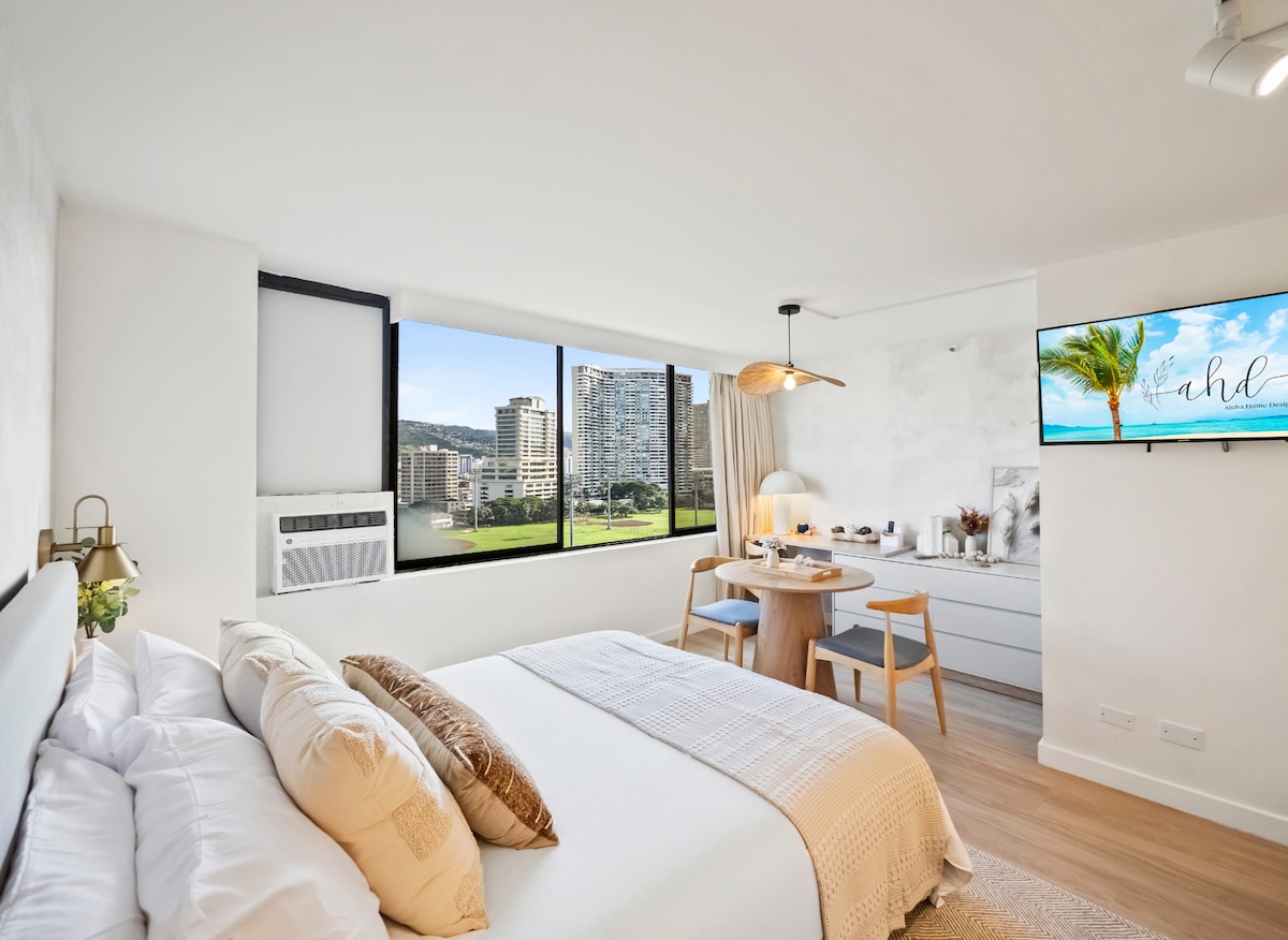 Zrekonstruovaný byt s 1 ložnicí/1 koupelnou v nejvyšším patře ve Waikiki. Krásný 180 stupňový panoramatický výhled na oceán z balkonu Juliet. Prohlédněte si páteční noční ohňostroj a západ slunce shora! Manželská postel Queen v ložnici. Koupelna má dvojité umyvadlo, skleněnou sprchový kout. Plně zásobená kuchyně. Nepřetržitá ostraha na místě. Centrální klimatizace, kabelová TV, WiFi v ceně. Garážové parkování za 33 USD na den. Pět minut pěšky na pláž Waikiki, hotel Hilton, lagunu Duke a nákupní centrum Ala Moana