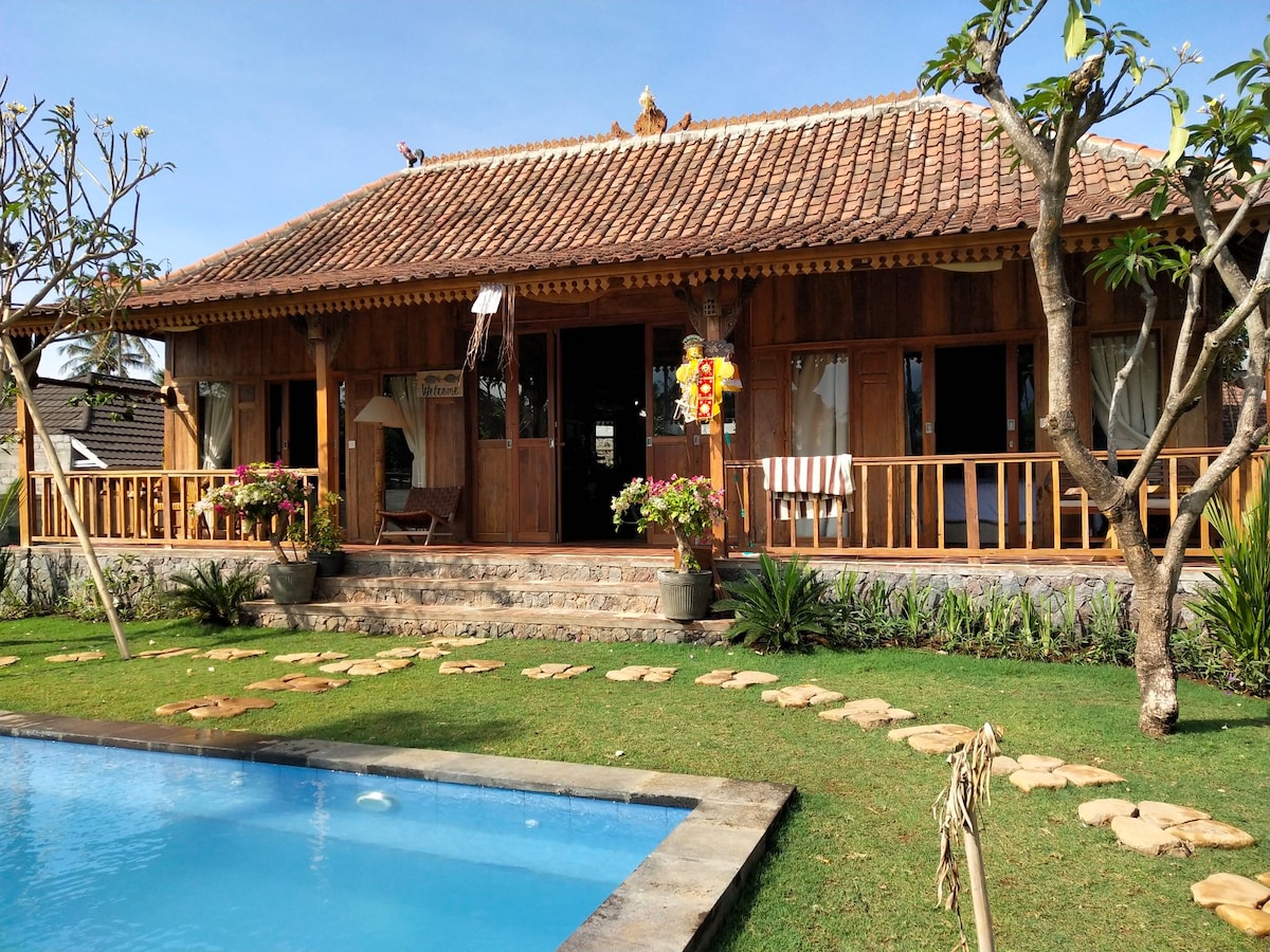 Užij si kouzlo venkovského Bali v této 3členné vile (v přízemí) s charakteristickým nábytkem. Probuď se a užij si velkolepý a neomezený výhled na Mount Agung, přímo z balkónu a okolních rýžových polí. Vychutnej si vynikající balijské jídlo v naší restauraci a ponoř se do našeho krásného bazénu. Organizujeme mnoho aktivit, jako jsou lezení, šnorchlování, výlety na pláže a do chrámů atd. Prohlédni si také mé další nabídky (obývací pokoj atd.) a najdi si dokonalý pokoj!