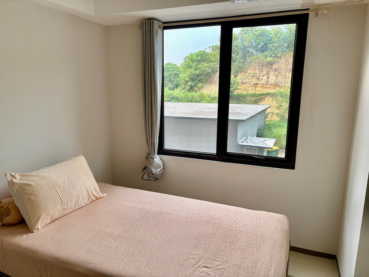Apartemen studio di kawasan MM2100 Cibitung dengan fasilitas pemandian air panas onsen, gym, jogging track, kolam renang, lapangan basket, dan taman bergaya jepang yang bisa dinikmati untuk berjemur maupun bersantai sore. Apartemen ini menghadap ke selatan sedikit miring ke timur, sehingga anda bisa menikmati indahnya sunrise langsung dari tempat tidur. Selain itu view malam hari juga sangat indah dengan kerlap kerlip lampu kota dan kendaraan yang lalu lalang melewati tol MBZ.