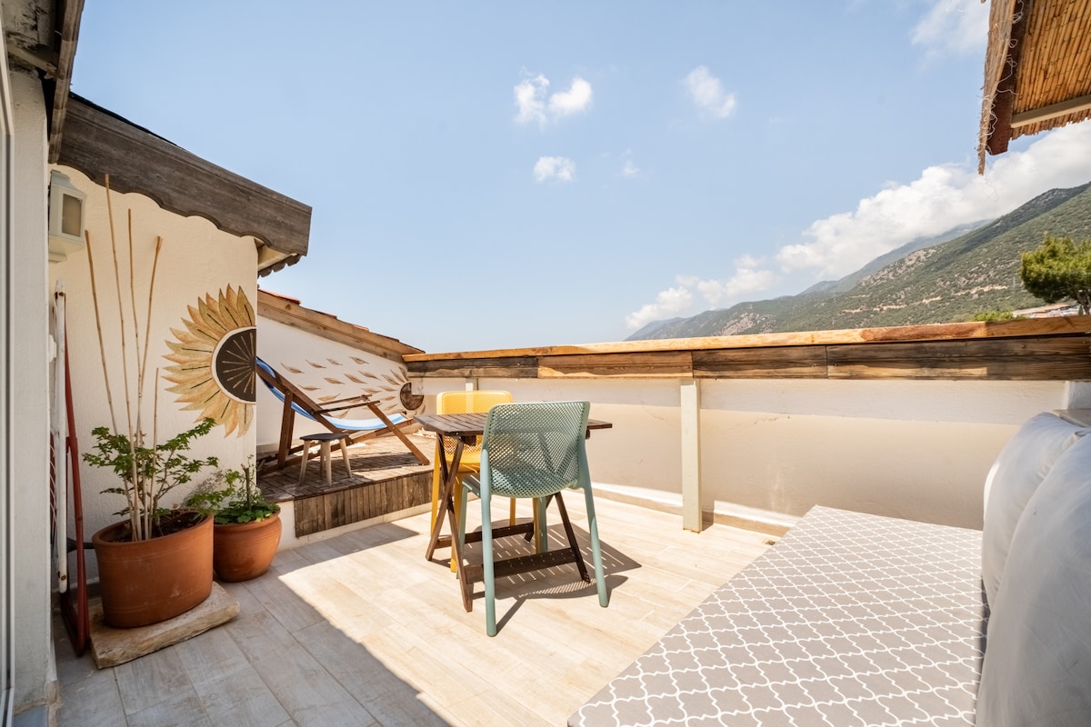 Úžasný penthouse v klidném centru Kaş, ulice Likya Velká střecha (35 m2) směřuje k přístavu Kaş a ostrovu Megisti (Kastelorizo) a na druhé straně se nachází lykijské skalní hrobky. 80 m2 plně zařízené cedrovým dřevem, kvalitními armaturami a vybavením.