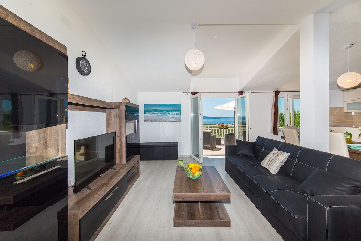 Nový,pěkně zařízený byt(83 m2),vybavený veškerým potřebným vybavením pro váš příjemný pobyt. Klimatizované,s bezplatným parkováním,Wi-Fi,satelitní TV a venkovním grilem pro vaše použití. Má velkou terasu(30 m2) s výhledem na moře. Nachází se na půli cesty mezi Splitem a Trogirem na klidném místě.