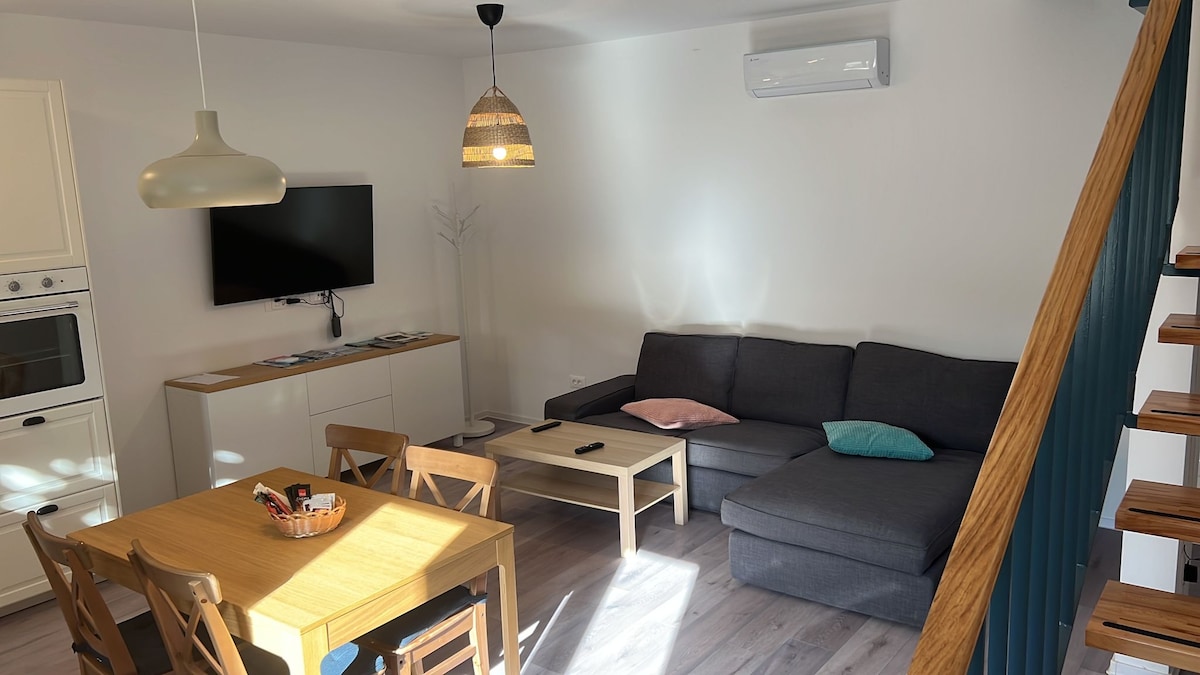 Apartment no 1 is our two floor apartment. Kitchen with dining area, Living room are on first floor among with spacious terrace where you can enjoy sea view. On second floor are two bedrooms and big bathroom. Modern and child friendly apartment is everything you need for your pleasant holidays.