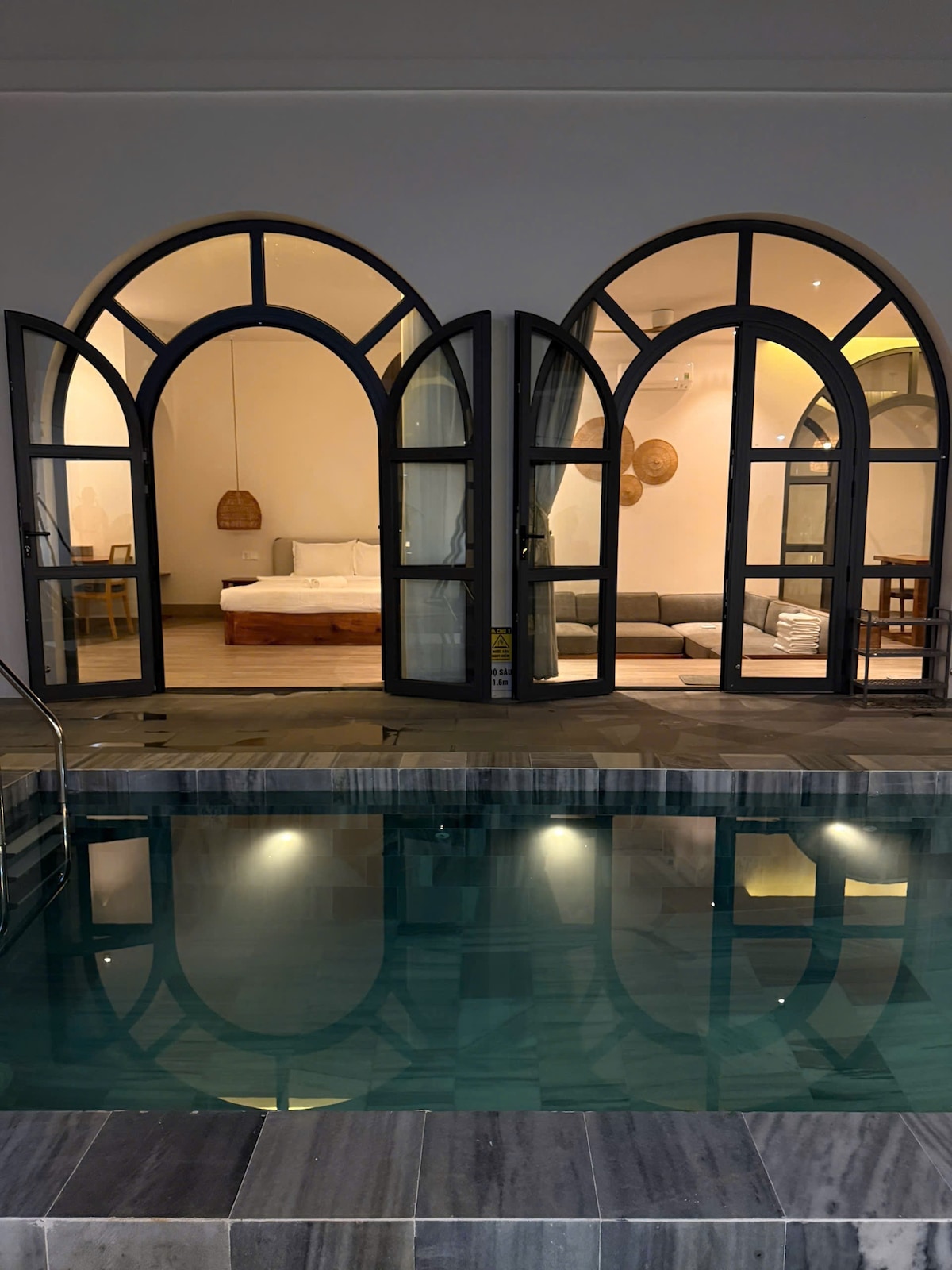 Vila se nachází v luxusním letovisku Bãi Khem🏖️, které nabízí 6 prostorných ložnic a moderní vybavení v indočínském stylu. Minimalistický a rafinovaný design využívá přírodní materiály, jako je dřevo a kámen, které vytvářejí klidnou atmosféru. Krytý společný bazén nabízí relaxační a společenský prostor 🏊♂️ Nachází se pouhých 500 metrů od pláže a poskytuje snadný přístup k bílému písku a křišťálově čisté vodě🌊, čímž kombinuje moderní pohodlí s klidným životním stylem.