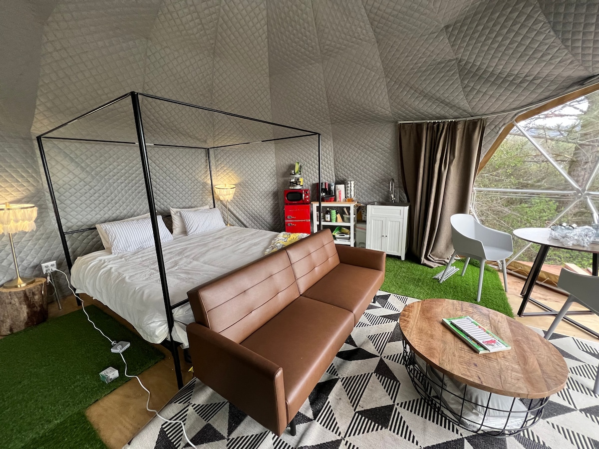 Glamp in style just 15 mins from Kings Canyon & Sequoia! Naše útulné geodetické kopule o rozloze 40 akrů zahrnují klimatizaci, wifi, chytrou televizi a obrovské okno s krásným výhledem. Užij si soukromou venkovní terasu, přístup do moderní soukromé koupelny (30 metrů daleko) a společnou venkovní kuchyň s grilem. Dome offers sweeping views of the valley and mountains. Klidné, jedinečné a ideální pro páry nebo sólo dobrodruhy.