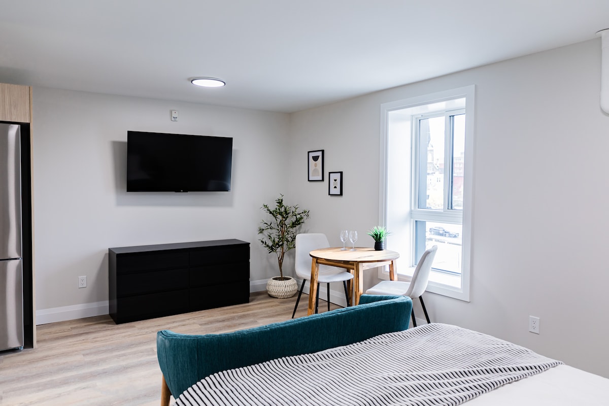 Welcome to our open concept highrise with city views in the heart of Kitchener-Waterloo, where style and comfort meet to create a truly memorable stay. Tato otevřená koncepční jednotka s 1 ložnicí je promyšleně navržena tak, aby pojala až 4 hosty, takže je ideální pro páry, malé rodiny nebo sólo cestovatele, kteří hledají moderní a útulné útočiště. ✔ Plně vybavená kuchyň ✔ Pohodlná ložnice s manželskou postelí velikosti Queen ✔ Otevřený koncept obývacího pokoje ✔ Vysokorychlostní Wi-Fi ✔ Bezplatné parkování ✔️Přístup do posilovny Zjisti více níže!