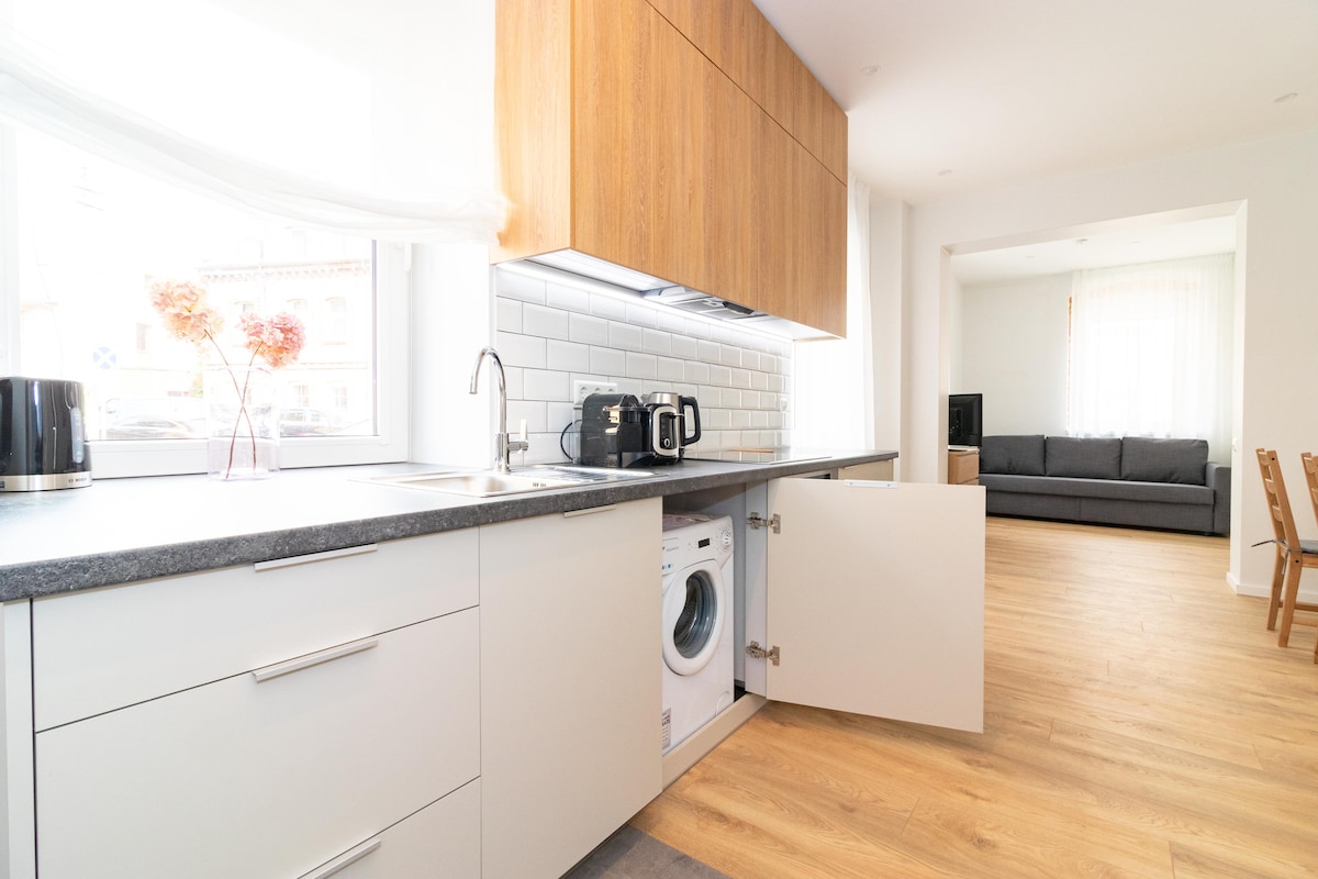 Apartmán má 1 ložnici a 1 obývací pokoj s kuchyní. Je plně zařízený, má velmi rychlou Wi-Fi, chytrou televizi. Hosté vždy najdou kávu a čaj. Soukromé parkování zdarma veřejné parkoviště zdarma. Byt se nachází ina velmi vhodné místo je centrum města, ale velmi docela a snadno dosažitelné jakékoliv místo z něj. Dům postavili Němci v roce 1905. Různé autobusové zastávky jsou v blízkosti, obchody stejně lze dosáhnout 5 minut chůze.
