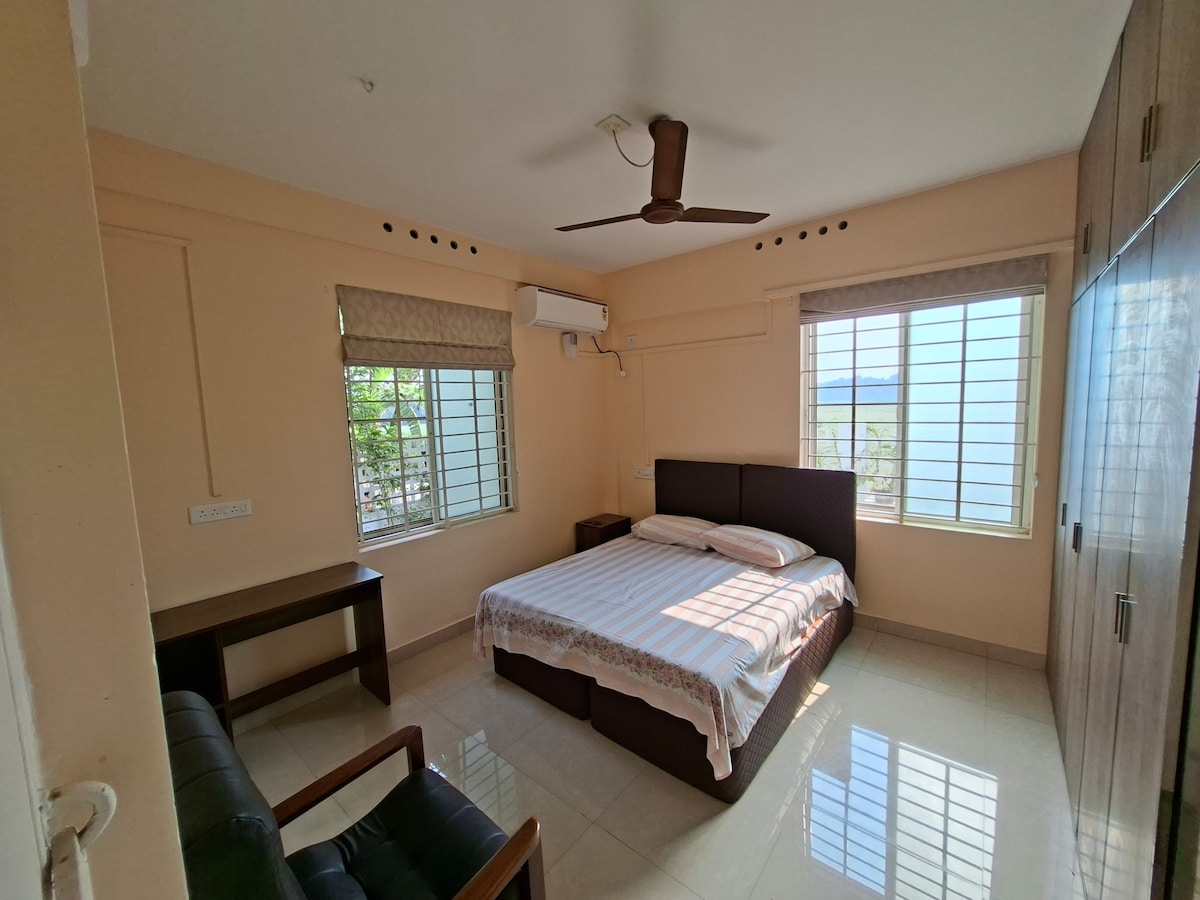 Vítej v mém klidném a útulném penzionu 2BHK, který nabízí naprosté pohodlí a soukromí. Nachází se v klidné čtvrti, ale zároveň v centru města Ernakulam. Původně jsem ho chtěl pronajímat jen svým hostům, ale teď je otevřený i pro rodiny a slušné hosty. Domov se nachází v nejvyšším patře mé soukromé třípatrové budovy a nabízí pohodlný pobyt. Jedna ložnice je klimatizovaná a dva balkony zajišťují skvělé přirozené světlo a větrání. Před příjezdem je nutné předložit dokument KYC