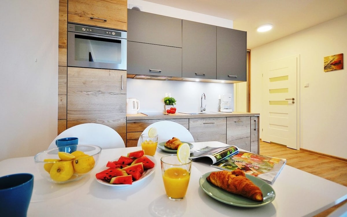 A two-bedroom apartment "Pod Masttami" with access to a swimming pool, saunas, a gym and a playroom for the little ones is a noteworthy offer! Byt se nachází v přízemí moderního zařízení, které se nachází v lázeňské části města Kołobrzeg. The property is only 400 meters from the famous Kolobrzeg beach and only 300m from the promenade. Sousedství je bohaté na rozmanitou gastronomickou a léčebnou základnu Byt je ideální pro 5člennou rodinu!