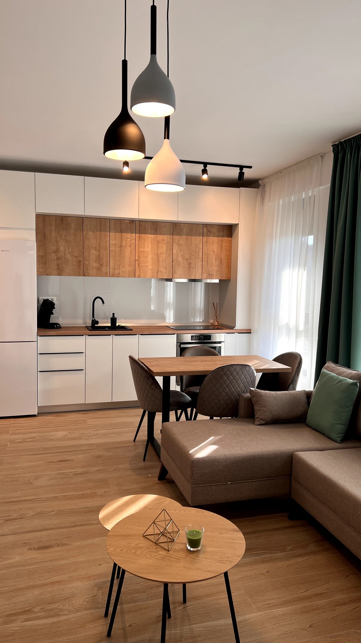 Apartament nou, luminos, cu design modern și parcare gratuită. Se poziționează la intrarea în Timișoara, în vecinătatea benzinăriei Esso. Apartamentul este dotat cu: -bucătărie complet utilată cu cele necesare: plită electrică, cuptor, mașină de spălat vase, frigider, aparat de cafea și veselă. -sufragerie open space în care oaspeții se pot bucura de un film, pe o canapea confortabilă, la un televizor Smart -dormitor cu pat matrimonial -baie cu cabină de duș și mașină de spălat rufe cu uscător.