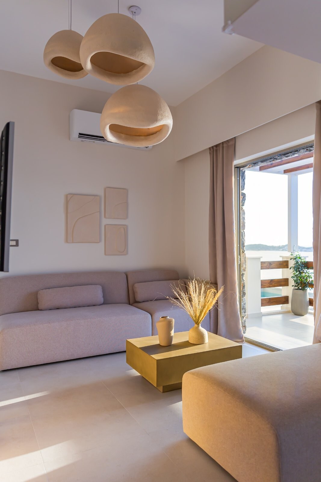Naše rodinné apartmá Thalassa převzalo své jméno podle řeckého slova „Moře“ inspirovaného nekonečnou modrou Egejským mořem. Navrženo s pečlivým důrazem na detail, který poskytuje pohodlí, pohodlí a zároveň klid a diskrétní luxus. Naše apartmá má celkovou velikost 70 m ² a na terase je malý soukromý bazén. It can accommodate up to 4 adults and 2 children and has a wonderful view of the sea and the Arginon Bay.