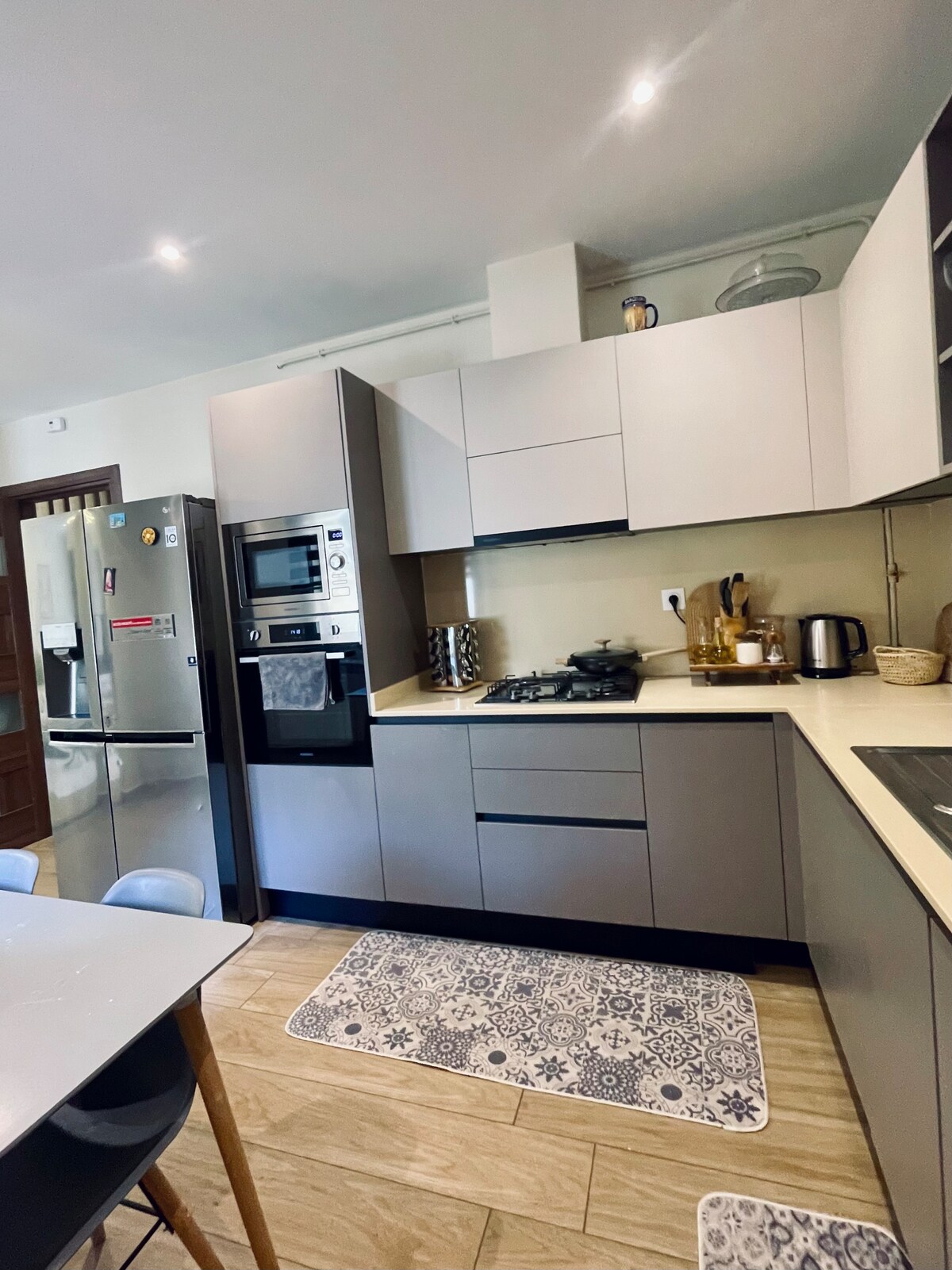 Moderní luxusní apartmán v El Kouba, ideální pro 4 osoby (možné + 2 děti). Ve 3. patře s výtahem a zabezpečením (odznak, videodohled). Velký obývací pokoj s 70" TV, Wi-Fi, plně vybavenou otevřenou kuchyní (pračka, myčka nádobí, trouba, mikrovlnná trouba). Dvě ložnice s velkými manželskými postelemi, ortopedickými postelemi, šatnou; jedna s 50" TV. Venku s grilem, zahradním stolem. Nepřetržitá teplá voda, bezplatné parkování, detektory kouře a CO, lékárnička. Zákaz kouření, klidná atmosféra.
