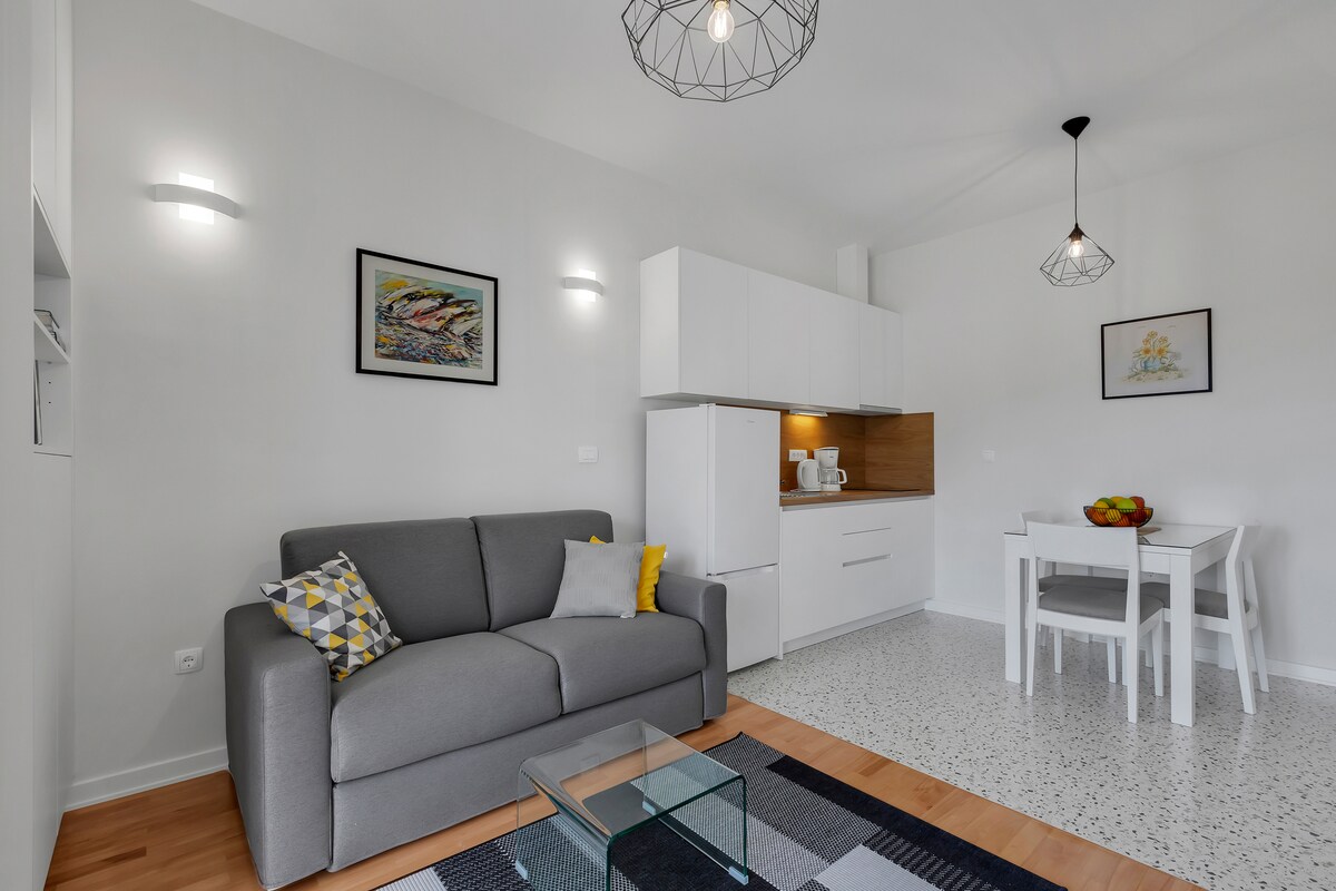 It is the apartment - studio 18 m2 on the third floor, which is the room with the french bed , bathroom, mini kitchen with eating place, sat tv, wifi, essentials, airconditioning, balkony facing the sea, free parking place The distance to the old place is 150 meters, to the the sea - lungomare, market, main square, restorants, caffes, discos , church, banks, harbour, markets 200 - 250 meters, bus station 250 meters, the beaches 450 meters, eskursions to islands Brač and Hvar possible.