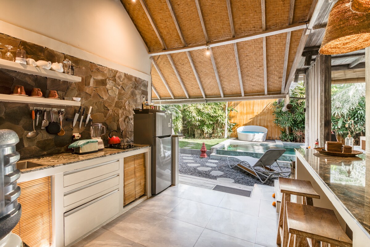 Vila pro novomanžele s obrovským bazénem a kokosovou zahradou. Skvělá poloha v pěší vzdálenosti od všech restaurací a kaváren v Canggu. Obrovský soukromý bazén a celodenní slunce ideální pro opalování na terase. Dvě ložnice mají manželské postele, klimatizaci a 55" TV + koupelny. Obývací prostor s klimatizací, plně vybavenou kuchyní, jídelním koutem a Bluetooth reproduktorem. Personál přichází denně na úklid a na stůl na masáže – ideální způsob, jak si odpočinout. Jsme obklopeni nejlepšími kavárnami a restauracemi na Bali, epickou lokalitou na pláži Echo a Batu Bolong.