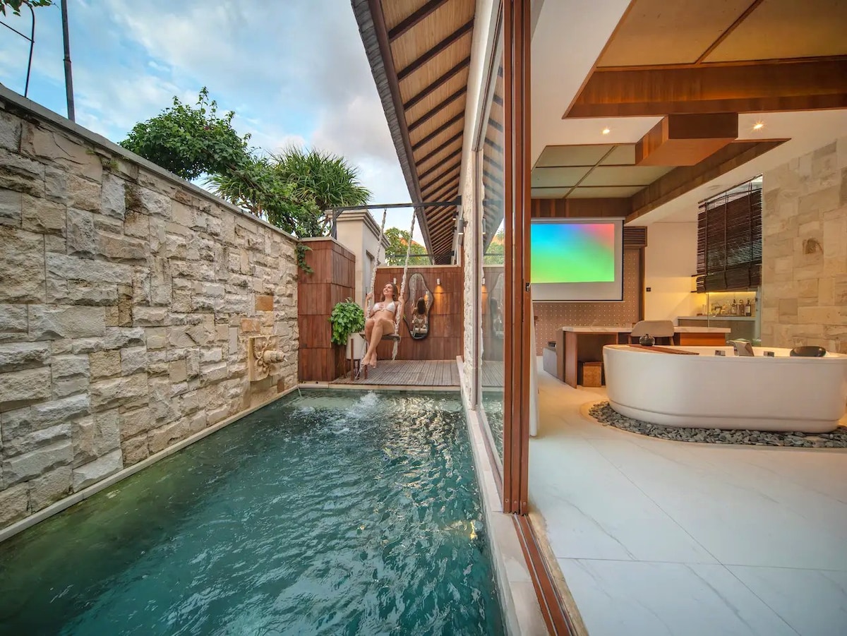 - BREAKFAST included - FREE Airport pick up min. 4 nights stay Romantic villa in Seminyak, only 2,4 km to Doublesix Beach. Located at complex villa - featuring one bedroom Villa ensuite bathroom with rain shower, private swimming Pool, in-room Bathtub, Swing and Hammock. Completed with Netflix, bluetooth speaker, Suitable for newlyweds or couple to spend intimate romantic moment in Bali.