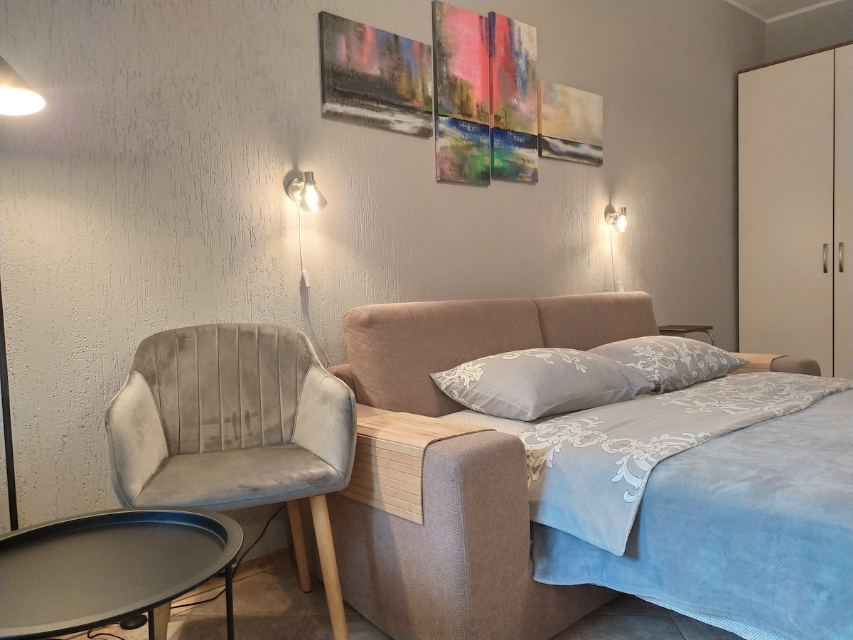 Renovated cozy studio apartment in the center near Arsenalna metro station. The apartment is on the 2 floor, from the windows you can see a beautiful park and the Kievo-Pecherska Lavra. The apartment has everything necessary for comfortable living and is thoroughly cleaned and disinfected before each guest. Perfect for a vacation or a business trip.