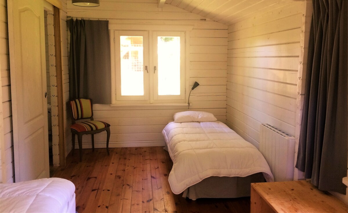 Naše malá chalupa o rozloze 12 m² může ubytovat 2 osoby, ideální pro pár. Je v naší zalesněné zahradě. Najdete zde sprchu (s bio sprchovým gelem/šamponem, VOLITELNÉ RUČNÍKY), kuchyňský kout (se sporákem, rychlovarnou konvicí, dřezem + základní koření: cukr, čaj, kávu, sůl, pepř atd.), manželskou postel (s povlečením), úložný prostor a suchou toaletu (venku). Zařízená a kvetoucí terasa vám umožní oběd a snídani ve stínu limetky.