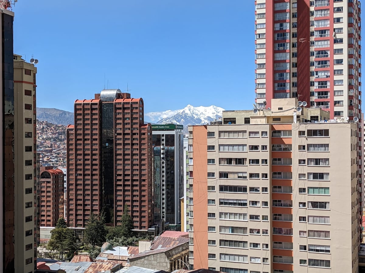 Penthause exclusivo con vista panorámica inigualable del "Illimani" y la ciudad. - Ubicado en el corazón de Sopocachi, cerca de supermercados, restaurantes y trasporte público. - Wifi 5G - Cocina independiente, Nexflix, lavadora y agua caliente. - Acceso seguro y privado con ascensores panorámicos y seguridad 24/7 1. Habitación principal cama QUEEN para 1 o 2 personas Dólares 38 (la segunda permanece cerrada) 2. Segunda habitación (opcional) cama doble disponible por 8 dólares por persona.