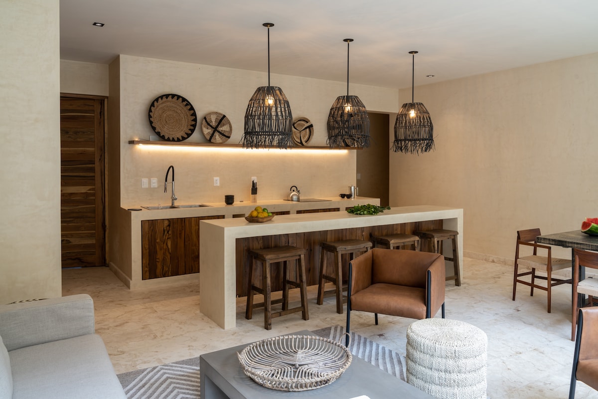 Umění pod 4 stěnami, ale v naší nové luxusní vile s 1 ložnicí neexistují žádné hranice. Jako součást jednoho z nejluxusnějších a nejfotogeničtějších bytů v sousedství nabízí náš apartmán s 1 ložnicí: ☆ soukromou terasu s vířivkou, nafukovací pohovkou a vstupem přes most. ☆ Nejmodernější boho-chic dekor. ☆ Přístup k jednomu z nejlepších vybavení bytů v Tulumu, včetně plně vybavené a klimatizované posilovny, 2 bazénů, lázeňské místnosti a coworkingových místností. Pokračujte ve čtení pro úplný seznam!
