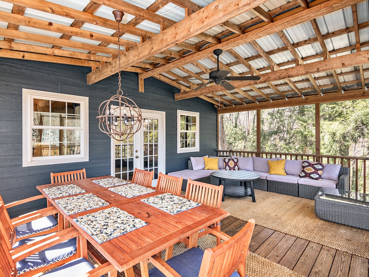 Odpočiňte si v jediném rekreačním pronájmu přímo na malebném jezeře Tomahawk a stezce, který se nachází v srdci Black Mountain. 20 minut do centra Asheville a 5 minut do historického Montreat. Ideální pro pár nebo rodinnou dovolenou pro více generací. Vychutnejte si večeři s výhledem na jezero na masivní kryté terase. 4 bloky pěšky do centra BMT. Vyspí se až 17 lidí, obří vířivka, plně zásobená kuchyně, nabíječka Tesla! Nedávno zrekonstruované, stylové, luxusní. Tvůj dokonalý pobyt čeká!