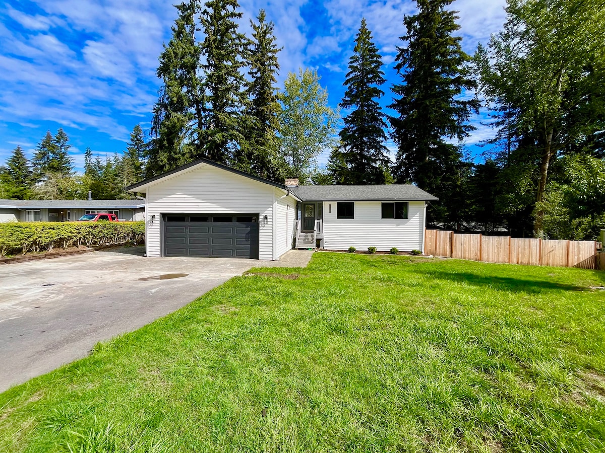 Náš klidný a krásný byt ADU na břehu jezera je vzdálen 20 minut od letiště SeaTac nebo 30 minut od Seattlu autem. Je to ideální místo pro vaše oblíbené turistické atrakce nebo přírodní aktivity, stejně jako snadná cesta do lyžařských středisek. Zahrnuje ložnici (s manželskou postelí velikosti Queen), koupelnu, obývací pokoj, plně vybavenou kuchyň, jídelní kout, prádelnu, vysokorychlostní Wi-Fi a vyhrazený stůl, které jsou skvělé pro práci na dálku. Máte také plný přístup do zahrady a doku, kde si můžete vychutnat vodní aktivity a čerstvý vzduch.