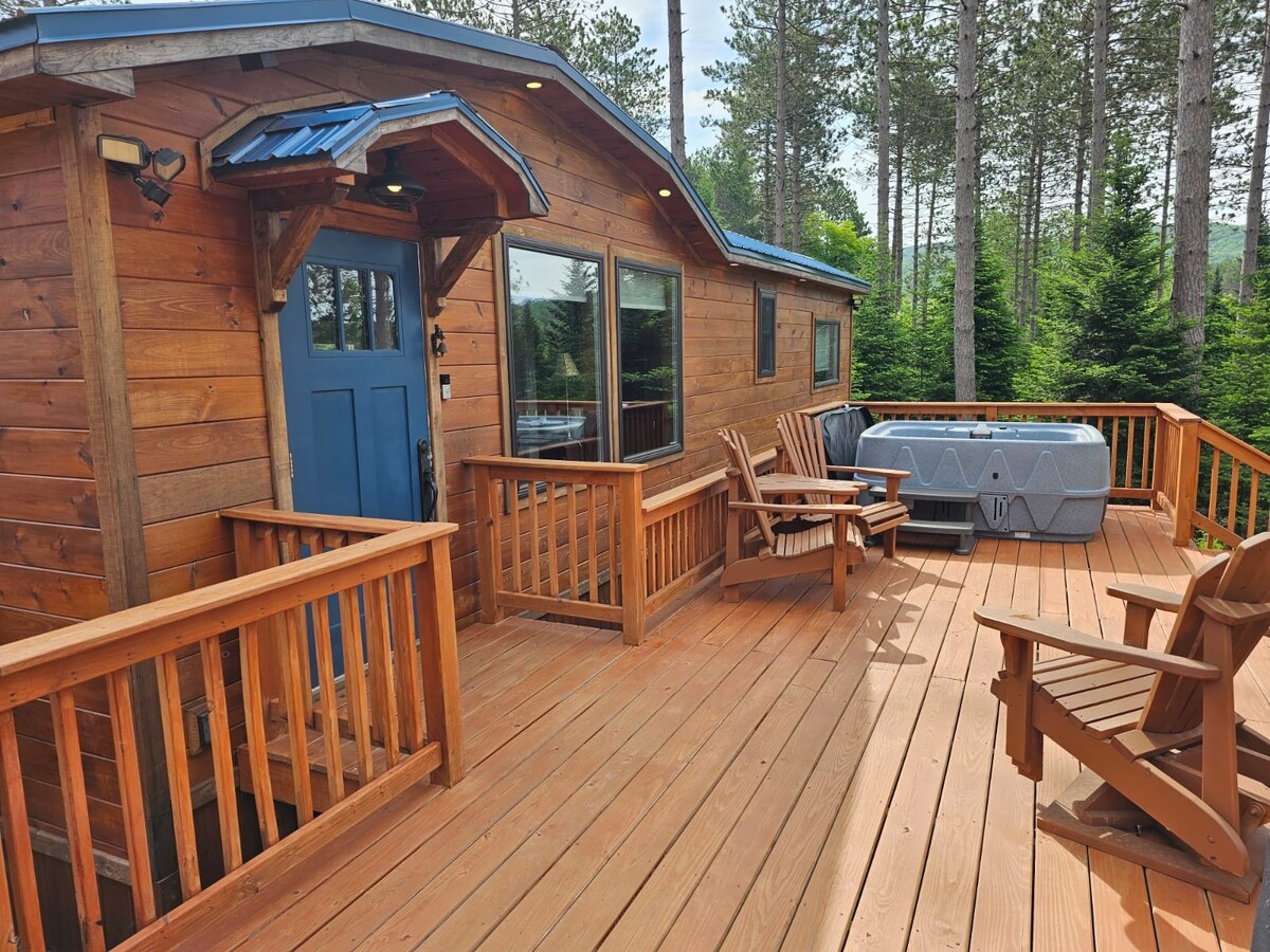 Dřevěný dům ve tvaru A s vířivkou a saunou
