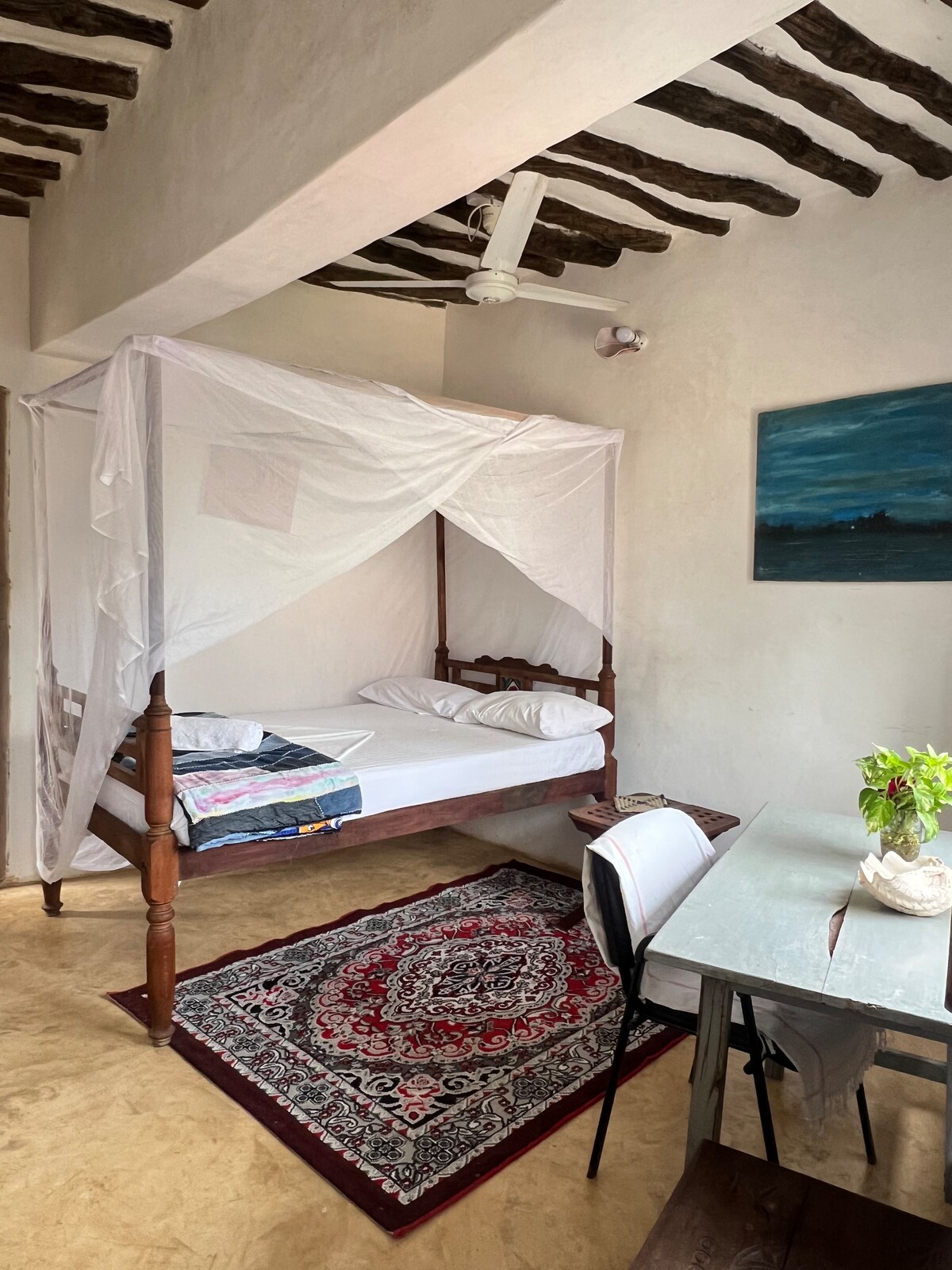 Klenot plný světla. Dvoupodlažní apartmán se 3 ložnicemi a nádhernou střešní verandou. Vychutnej si relaxační a autentický zážitek z ubytování v centru dění. Každá ložnice má manželskou postel velikosti king, vlastní koupelnu, stropní a stojací ventilátory. Plně vybavená kuchyně. Personál je k dispozici pro nákupy, úklid a přípravu jídel. Prohlédněte si vesnici a město Lamu. Pláž je 5 minut pěšky. Užijte si západ slunce, rybaření a šnorchlování a úžasné svahilské jídlo v nádherných kavárnách a restauracích.