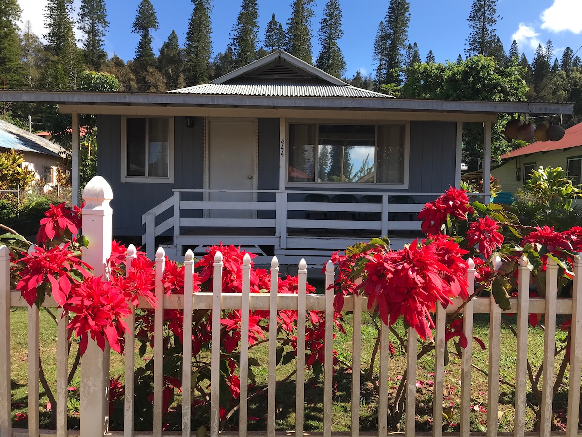 Our one bedroom cottage rests on the hill above Lānaʻi. It offers a complete kitchen and a lovely view from the covered lanai. Shady and cool, we are a 12 minute walk into town. There is no need for either AC or heat. While we do have ceiling fans in every room, you will find Lānaʻi to have a lovely climate with tropical breezes during the day and cool, upcountry temperatures for great sleep in the evenings.